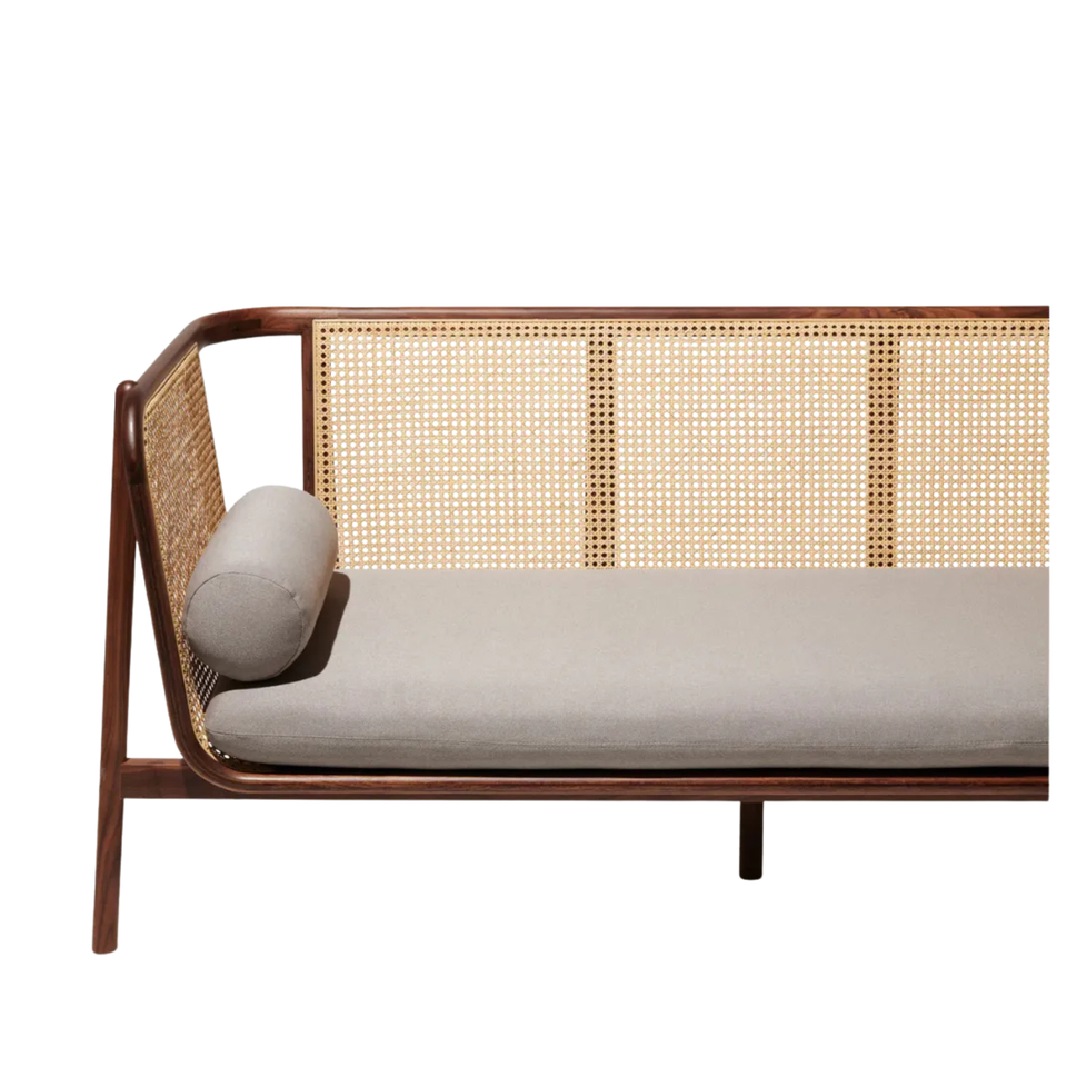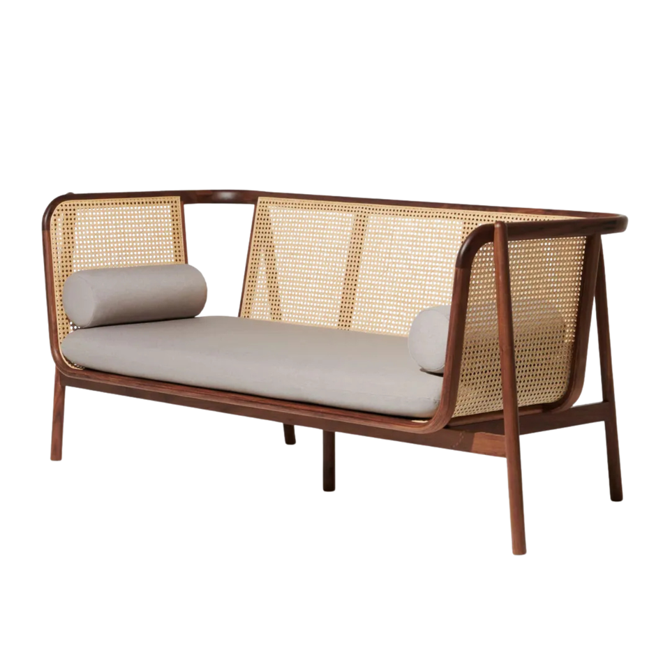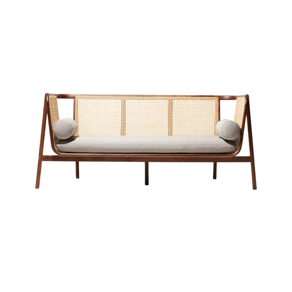 โซฟาไม้สักแท้สไตล์มิดเซ็นจูรี่ พร้อมพนักพิงหวายธรรมชาติและเบาะรองนั่งทรงกลม เฟอร์นิเจอร์ห้องนั่งเล่นทันสมัย