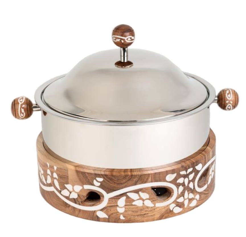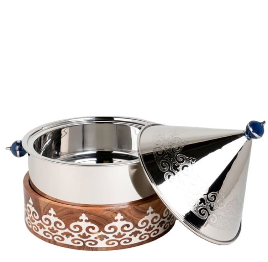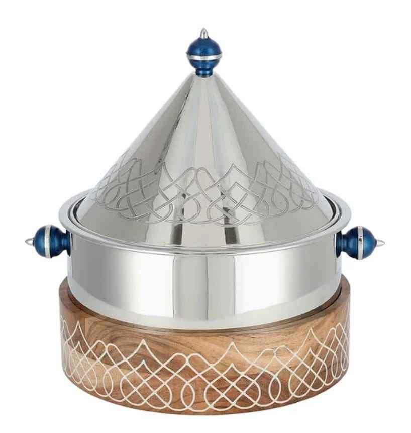 หม้อตุ๋นสแตนเลสสีเงินพร้อมฐานไม้สำหรับงานปาร์ตี้บุฟเฟต์งานแต่งงานโรงแรมดีไซน์ตะวันออกกลาง