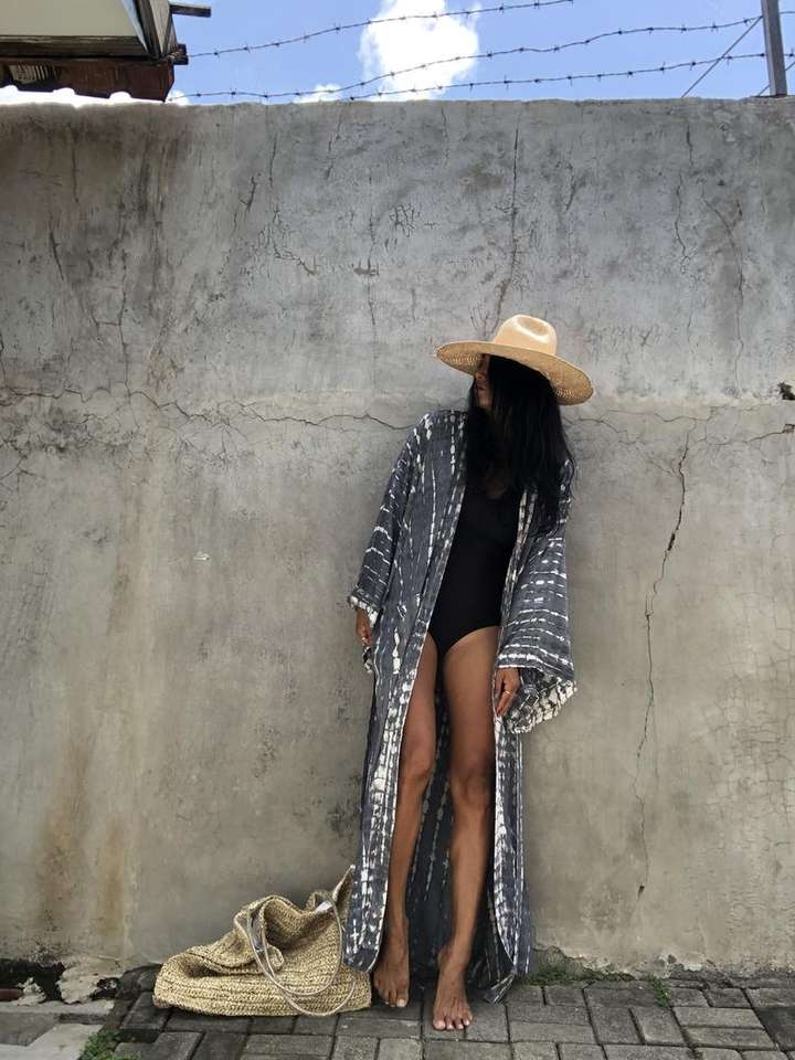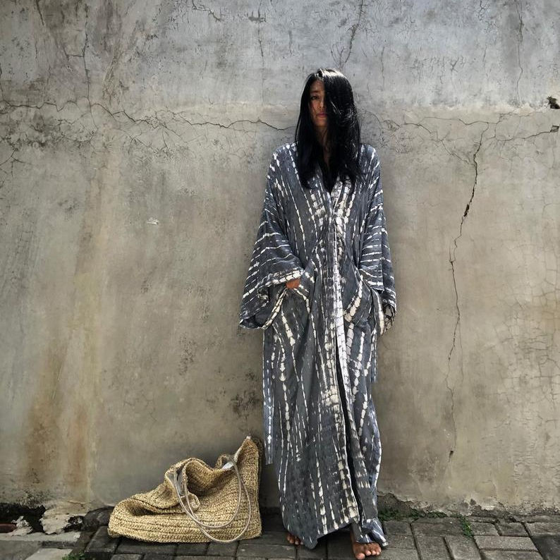 ชุดนอนเดรสคาฟตันคอวีลึกลายทางแบบลำลองทรงหลวมใส่เดินชายหาดและใส่ในรีสอร์ทชุดบิกินี่คลุมชุดเดรสคาฟตัน