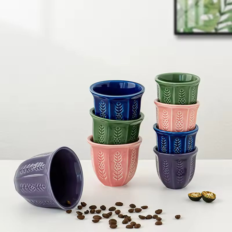 แก้วกาแฟเซรามิกหลากสีสไตล์อาหรับ ขนาด 100-250 มล. ขายดีในตะวันออกกลาง - ใช้ซ้ำได้ เป็นมิตรต่อสิ่งแวดล้อม เหมาะสำหรับเป็นของขวัญ
