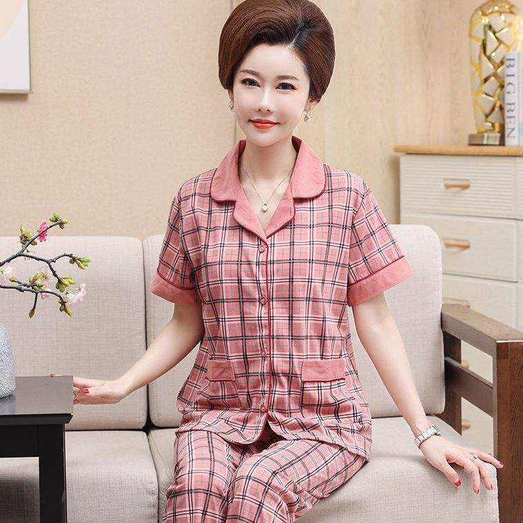 ชุดนอนผ้าฝ้าย100% สำหรับคุณแม่วัยกลางคน, กางเกงแขนสั้นคอปกทรงหลวมสำหรับผู้หญิงสำหรับฤดูร้อน