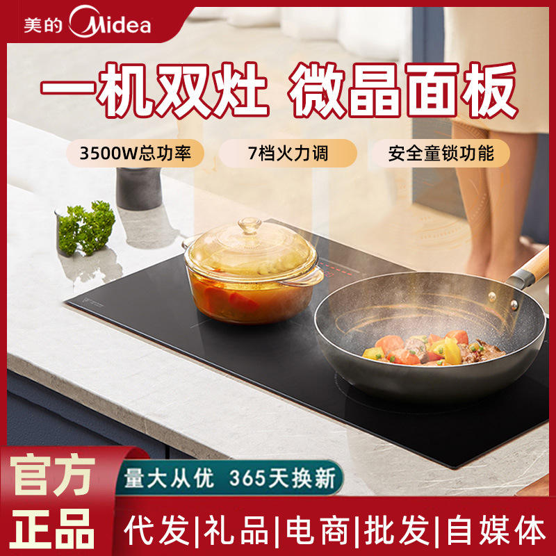 เตาแม่เหล็กไฟฟ้า Midea แบบสองหัวเตา 2200 วัตต์ ควบคุมด้วยระบบสัมผัส แผงไมโครคริสตัลไลน์สแตนเลสสีดำแบบฝัง