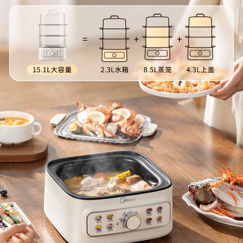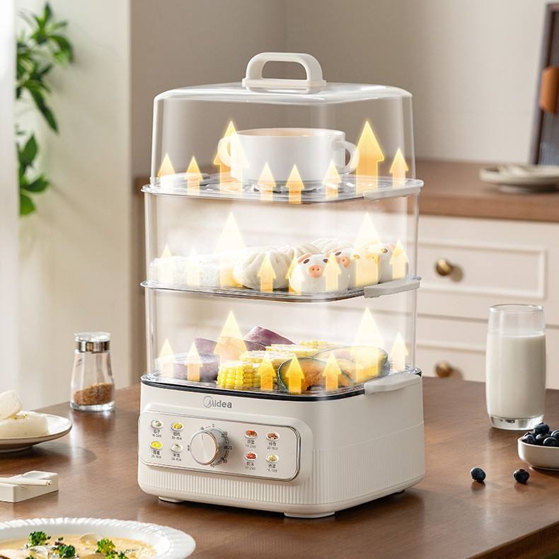 เครื่องนึ่งไฟฟ้ามีเดีย 15.1 ลิตร ความจุขนาดใหญ่สามชั้น พร้อมฝาปิดกระจกนิรภัย ควบคุมด้วยระบบกลไก สำหรับใช้ในบ้านและหอพัก
