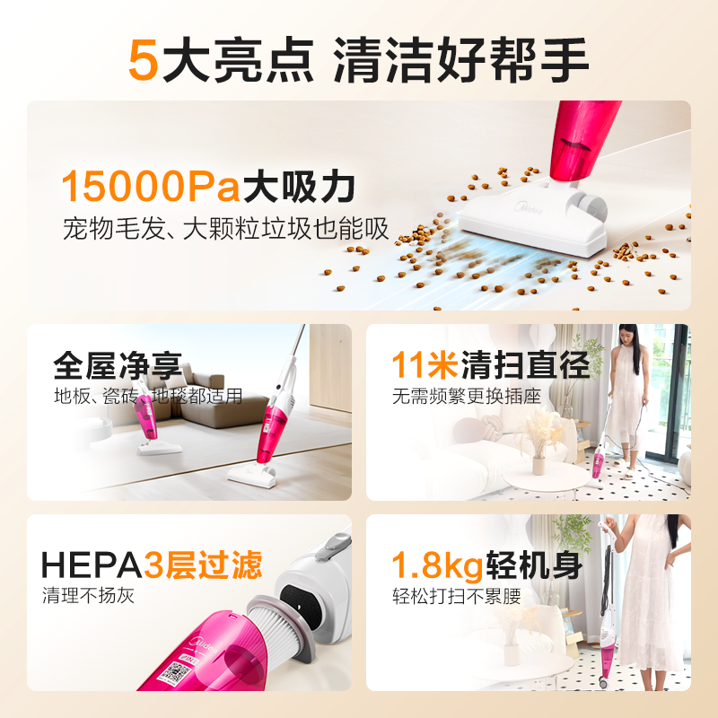 เครื่องดูดฝุ่นมือถือมีเดีย 1.8 กก. แรงดูด 15000Pa สำหรับทำความสะอาดเตียง พื้น และรถยนต์
