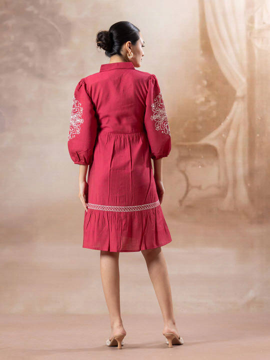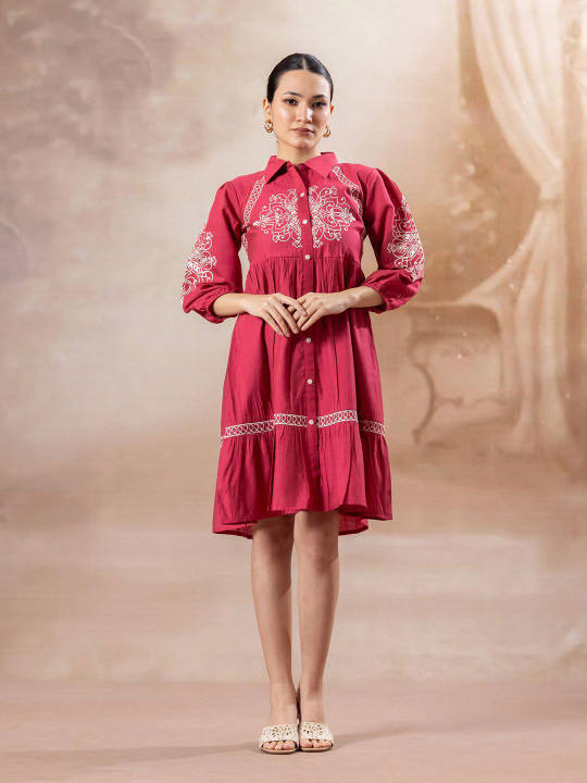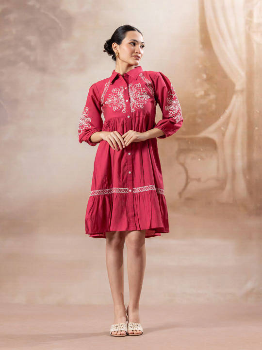 เดรสผู้หญิงทรงเอวเข้ารูป คอโอ ปักลายดอกไม้สามมิติ แขนพอง สไตล์โมเดิร์น รักษ์โลก