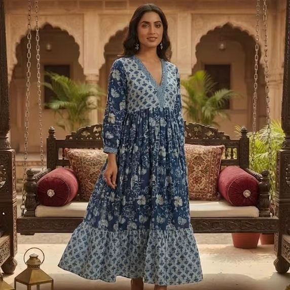 ชุดเดรสยาวปานกลางผ้าฝ้ายสีน้ำเงินกรมท่าพิมพ์ลายดิจิทัล คอวี แขนยาว สไตล์โบฮีเมียน สำหรับฤดูร้อน ลวดลายชาติพันธุ์ ซักได้ ผ้าธรรมชาติ