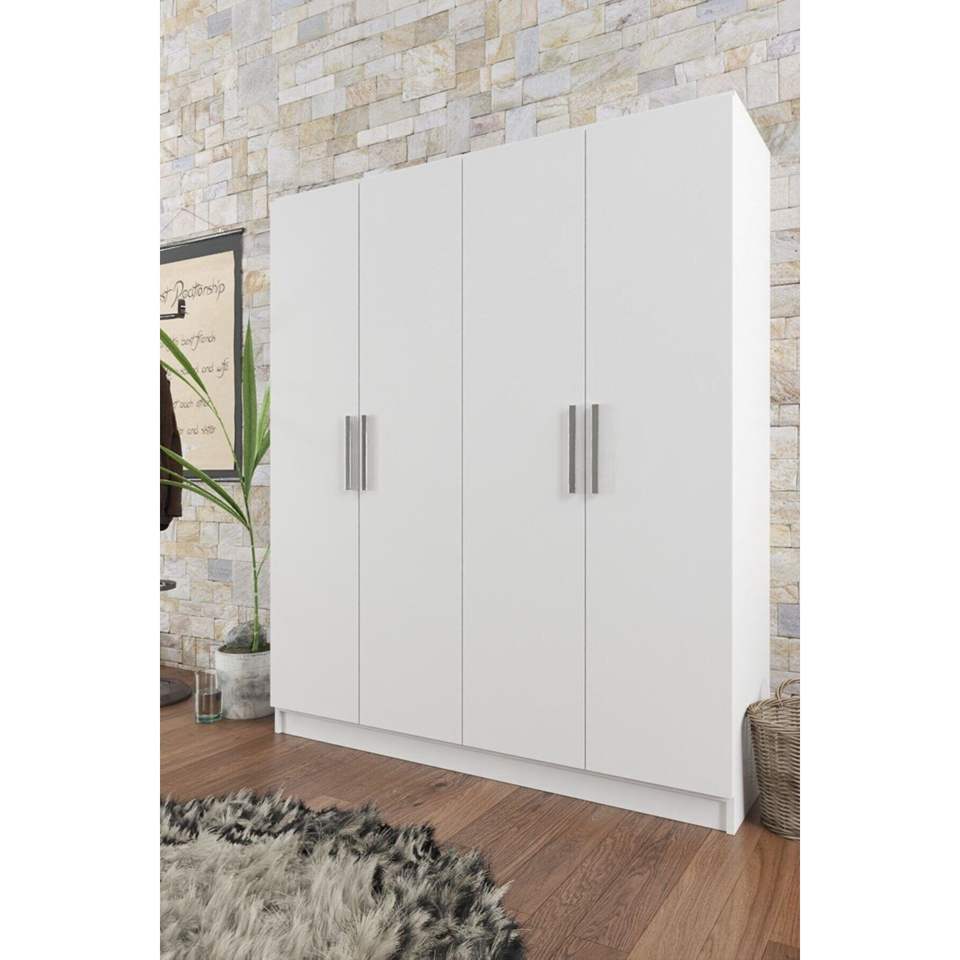 Milano ตู้เสื้อผ้าสีขาว4ประตูพร้อมชั้นวาง11ชั้นและไม้แขวน2ชั้นพร้อมที่เก็บของที่มีสไตล์และดีไซน์เรียบง่าย4โรงแรม-ห้องนอน