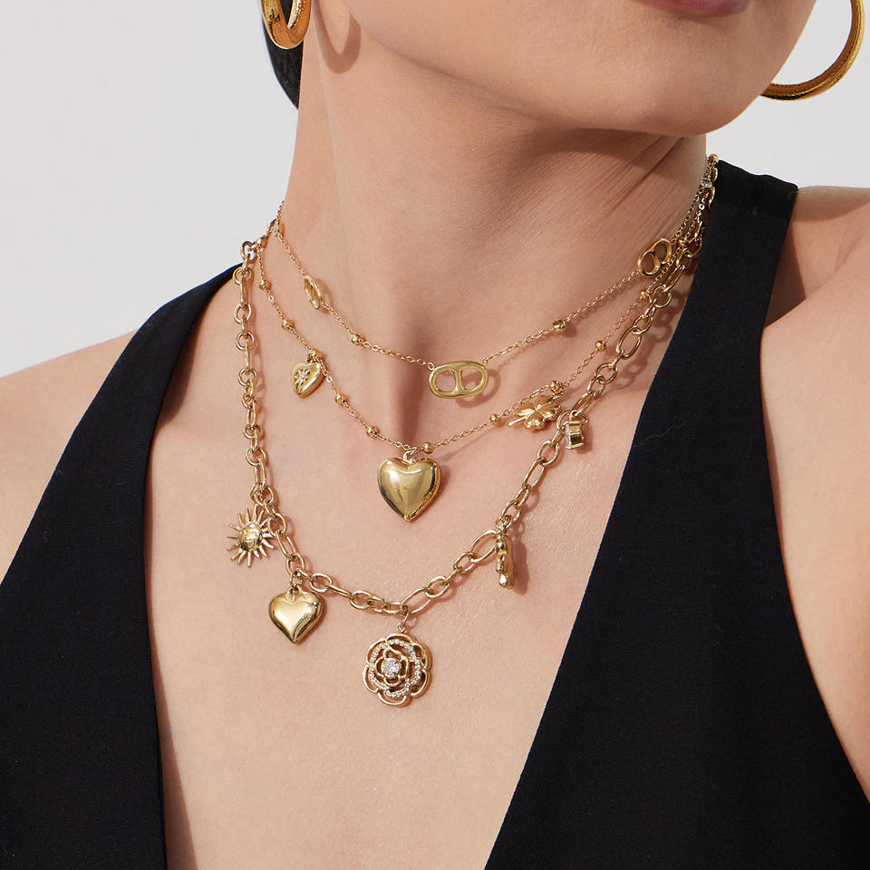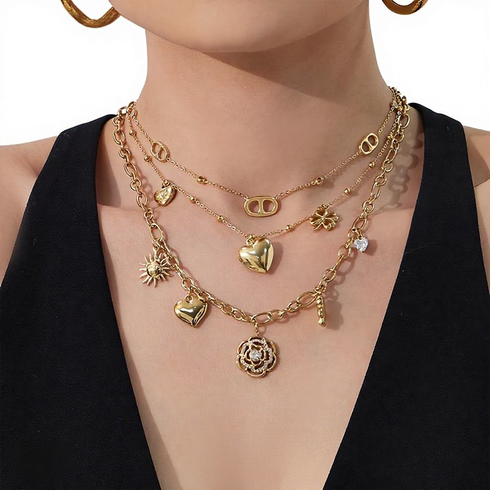 สร้อยคอสแตนเลสสตีลทรงสปอร์ตแบบสองชั้นรูปหัวใจประดับเพชรเต็มเส้น พร้อมจี้รูปดอกกุหลาบฝรั่งเศส Mili และเพชรซิคอน
