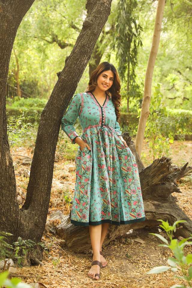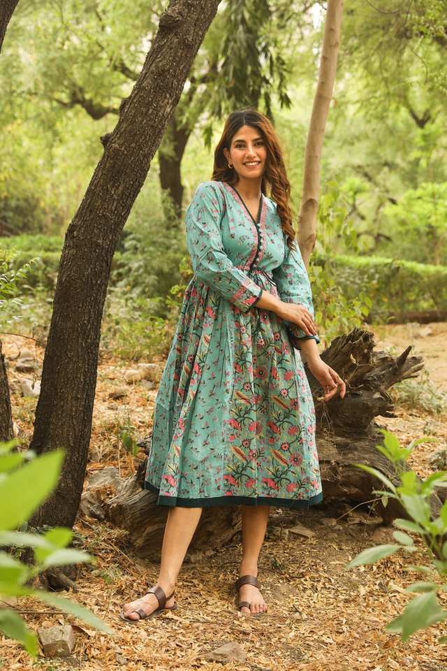Mimi Bohemian Midi Dress Hand Block Printed Pure Cotton Floral Blue Rose Casual Occasional Dress