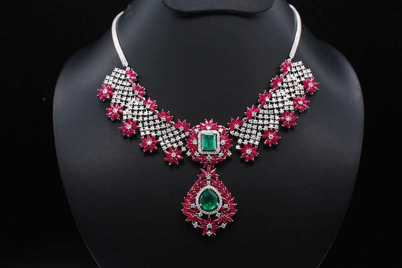 สร้อยคอไข่มุกเซอร์โคเนียมสีแดงทับทิมคุณภาพสูงต่างหูแบบยาวเครื่องประดับอินเดีย