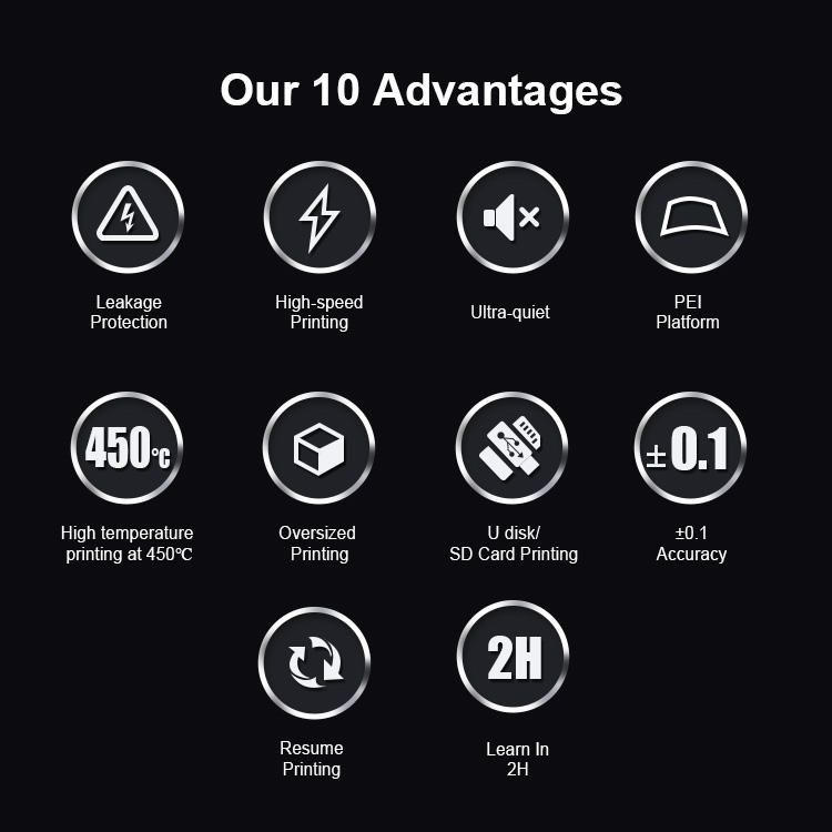 หลายแกน, เตียงอุ่น, Filament Detection, ปรับระดับอัตโนมัติ, อุณหภูมิสูง, ขนาดใหญ่, 1.75 มม., ประกอบง่ายในขั้นตอนเดียวคุณสมบัติ
