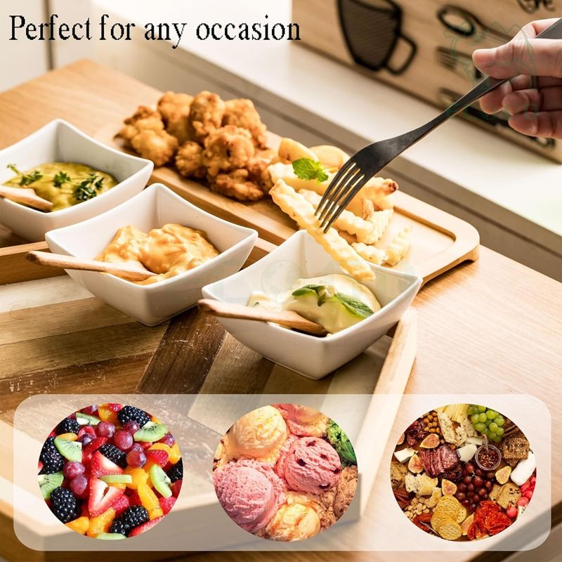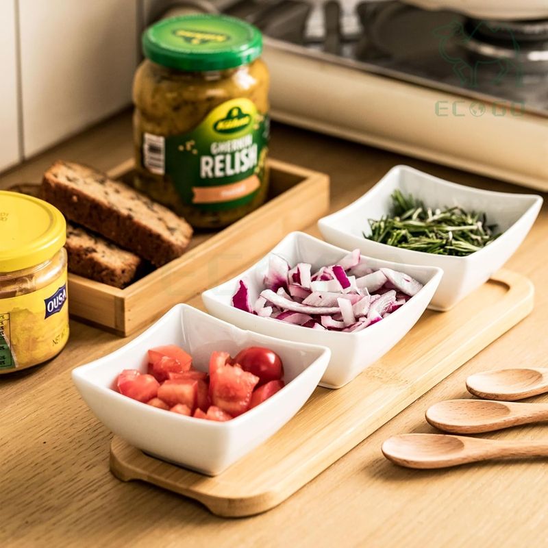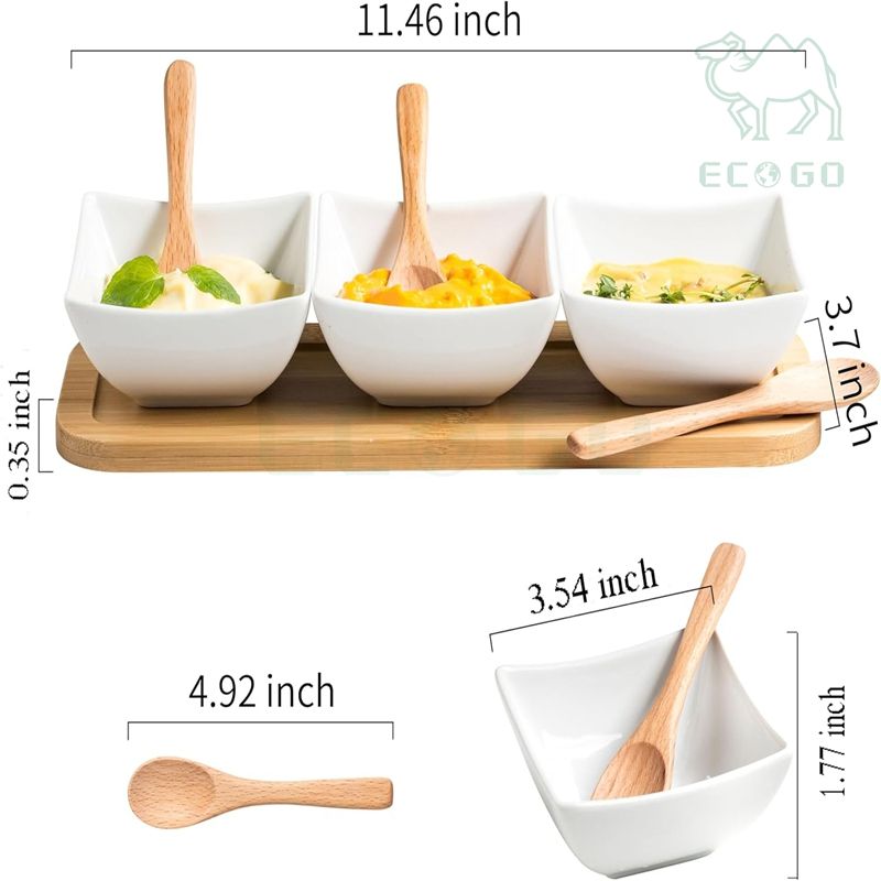 ชุดถาดเสิร์ฟอาหารไม้ไผ่ 3 ชิ้น พร้อมถ้วยเซรามิกสำหรับน้ำจิ้มและช้อน
