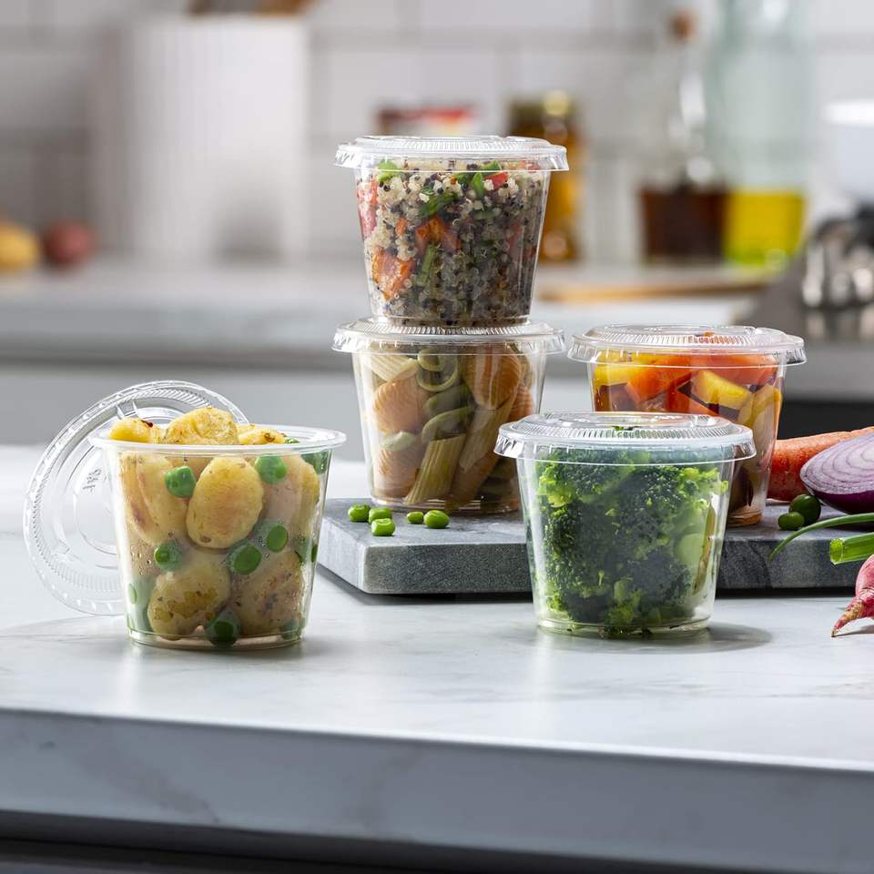 ถ้วยพลาสติกใสแบบใช้แล้วทิ้งขนาดเล็ก 5 ออนซ์ พร้อมฝาปิด 100 ชุด เส้นผ่านศูนย์กลาง 72 มม. สำหรับใส่อาหาร ซอส สไลม์ ยา ซูเฟล่