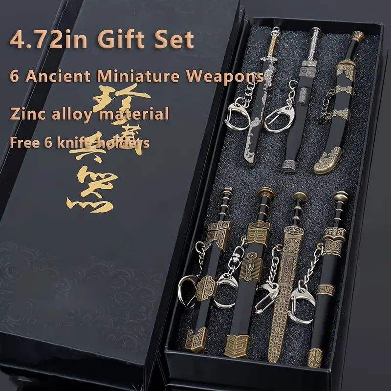 ชุดดาบโลหะโบราณขนาดเล็ก พร้อมฐานตั้งโชว์ 6 ชิ้น และพวงกุญแจแบบจำลอง 14 ชิ้น ของเล่นอาวุธโบราณ