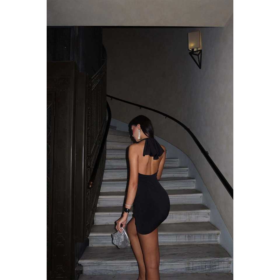 มินิเดรสสีดำสำหรับงานกลางคืนพร้อมดีเทลเข็มขัด