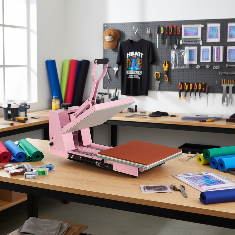 เครื่องรีดร้อนขนาดเล็ก 15x15 นิ้ว แผ่นความร้อน 38 ซม. กึ่งอัตโนมัติ สำหรับเสื้อยืด หมวก งานซับลิเมชั่น 220V