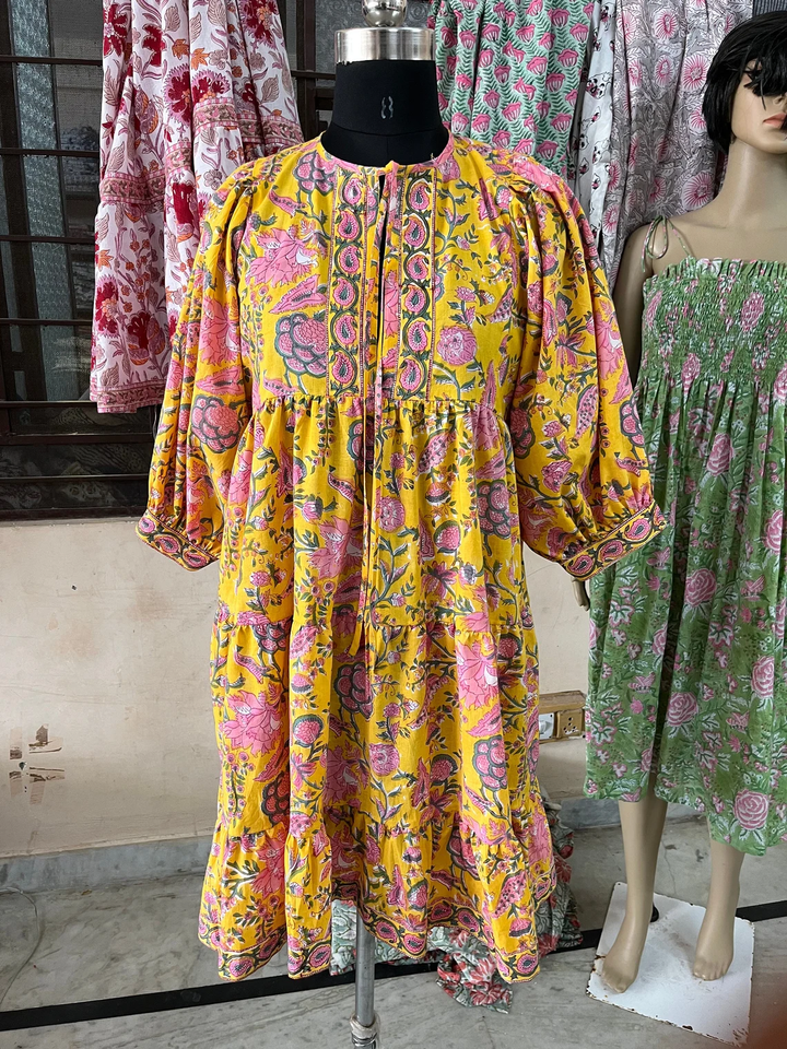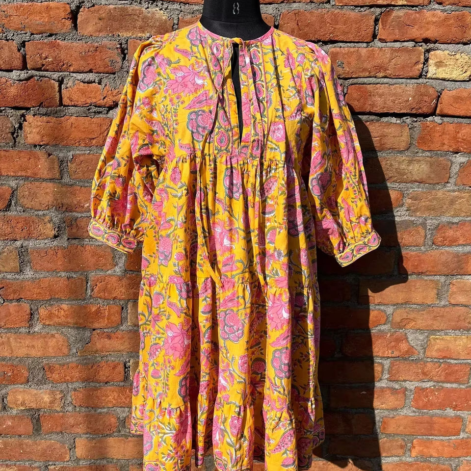 เดรสมินิเดรสผ้าคอตตอนปักดิ้นลึกสไตล์ลำลองมีสายปิดแบบ100% ลายดอกไม้บล็อกด้วยมือ