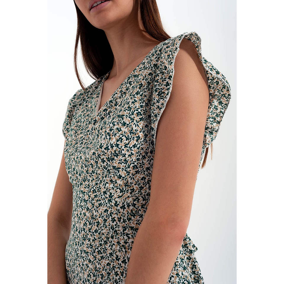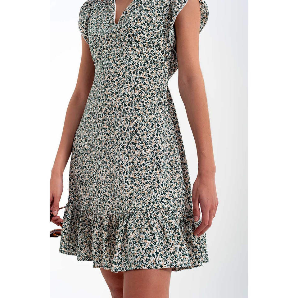 มินิเดรสแขนพองระบายลายดอกไม้เล็กๆ สีเขียว ระบายอากาศได้ดี ไซส์ XS-XXL แบบไร้สาย ดีไซน์รูชชิ่งหวานๆ สีพื้นธรรมชาติ เหมาะสำหรับใส่ในวันสบายๆ