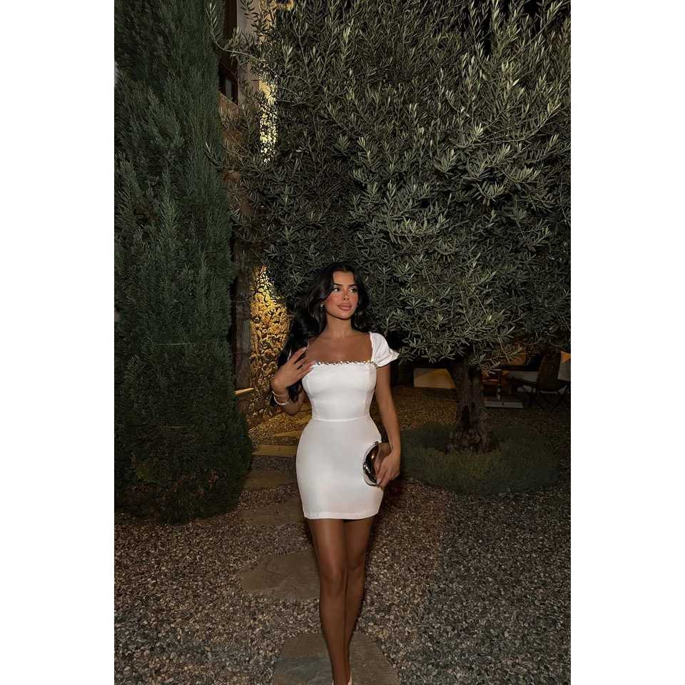 มินิเดรสสีขาว ผ้าวิสโคส 100% ประดับด้วยรายละเอียดหินสุดหรู