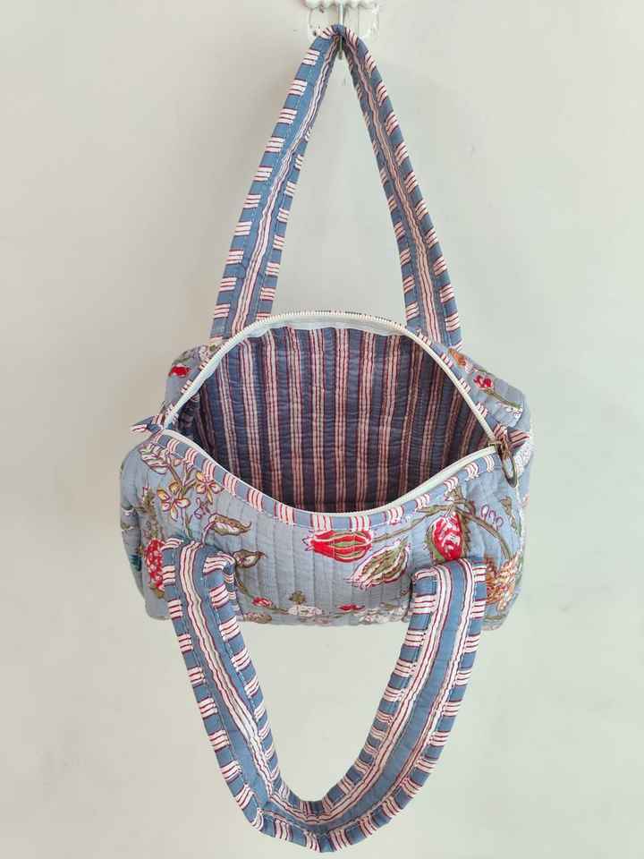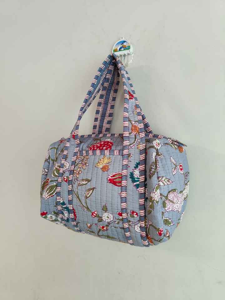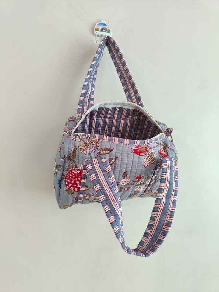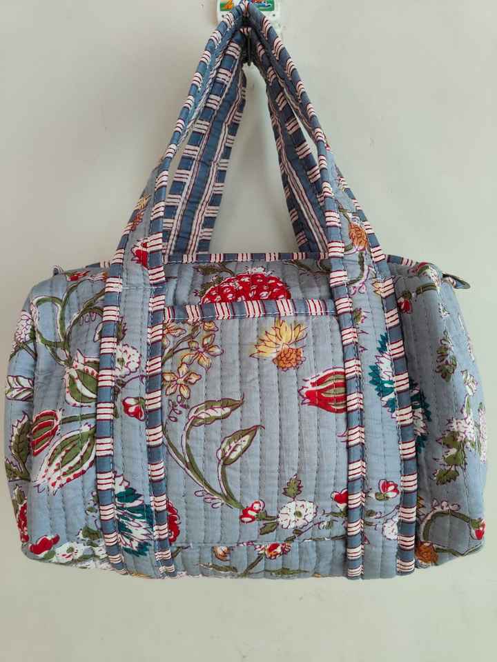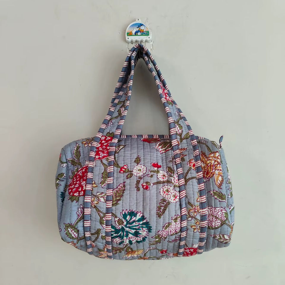 กระเป๋าเดินทางขนาดเล็กสำหรับผู้หญิง แฟชั่นทำมือ พิมพ์ลายบล็อก ตกแต่งดอกไม้ ผ้าฝ้ายเย็บติดกัน กระเป๋าช้อปปิ้ง กระเป๋าเจ้าสาว กระเป๋าชายหาด จากราชสถาน