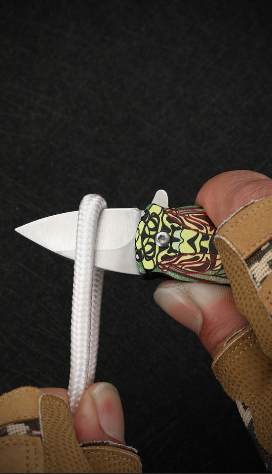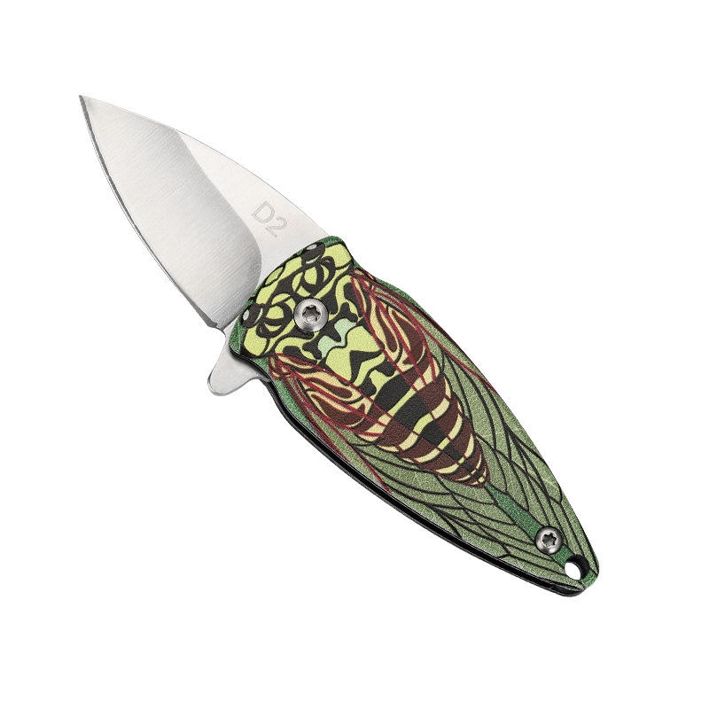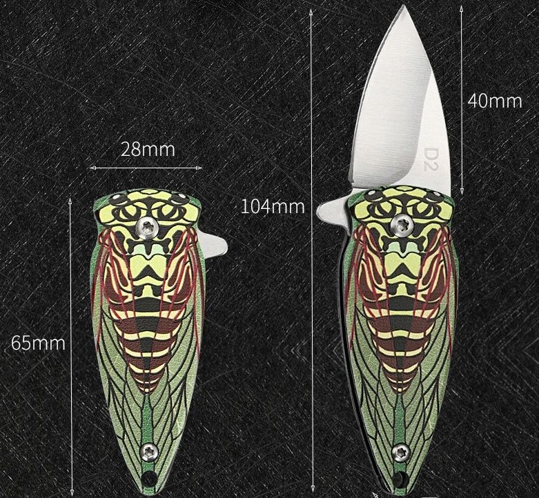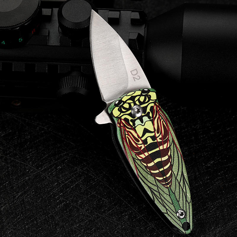 มีดพับเหล็ก D2แข็งสูงขนาดเล็กลายจั๊กจั่น EDC ล่าสัตว์ด้วงเขียวกลางแจ้งป้องกันตนเองตัดดาบเครื่องมือ