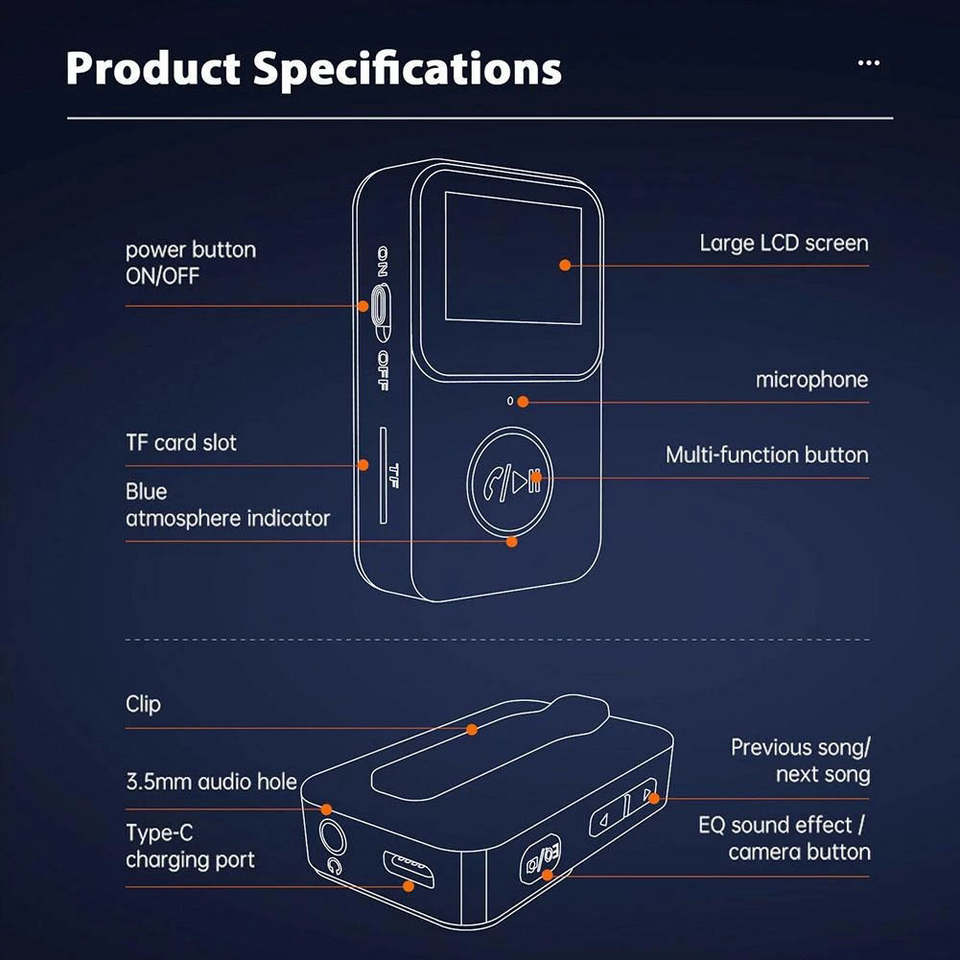 หน้าจอ LCD ขนาดเล็ก เครื่องเล่น MP3 แบบพกพา ตัวรับสัญญาณเสียง 3.5 มม. รองรับการ์ด TF ขยายหน่วยความจำ ใช้งานง่ายเพียงปุ่มเดียว เครื่องเล่นเพลง