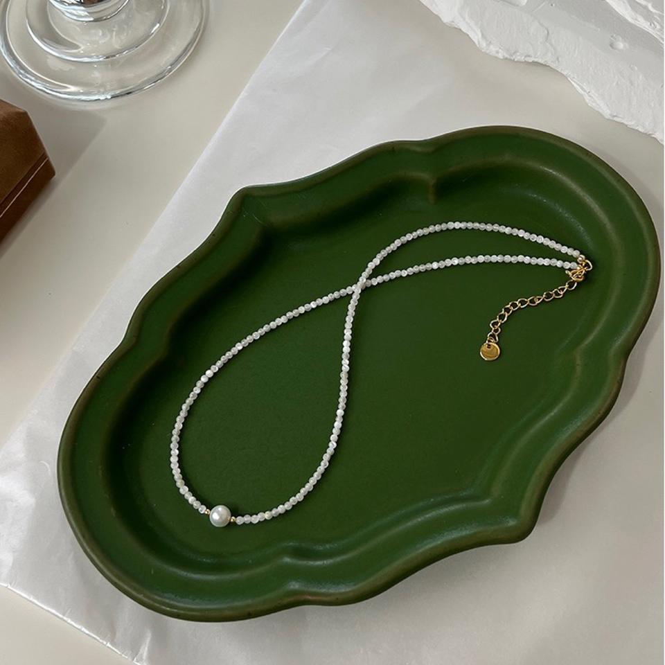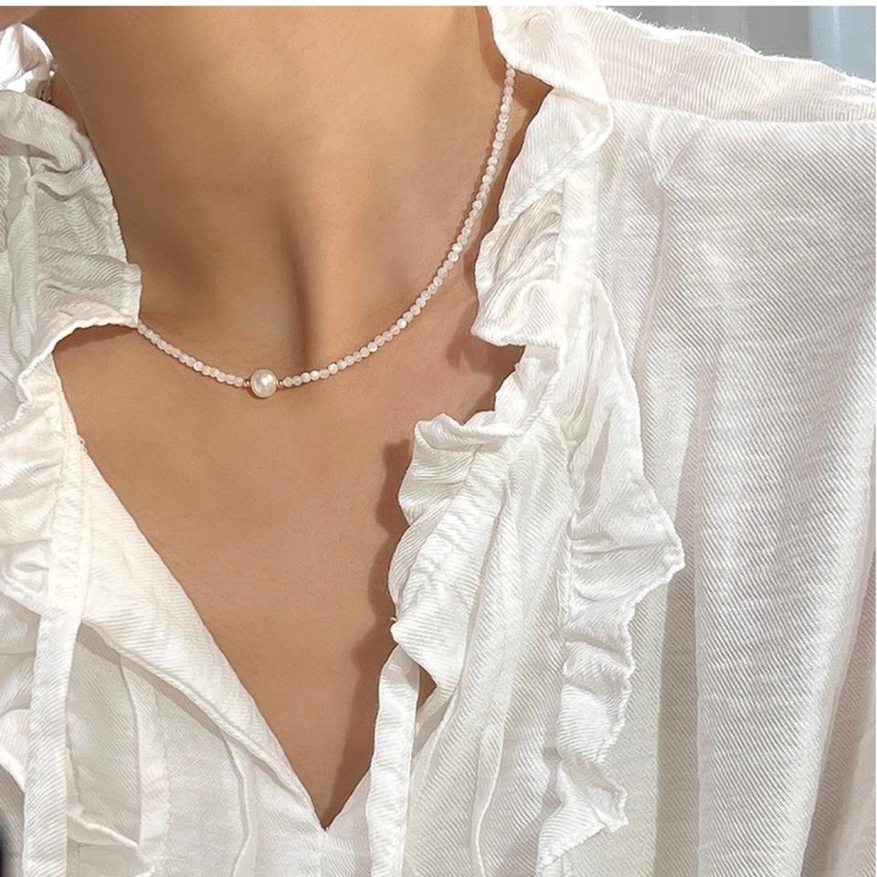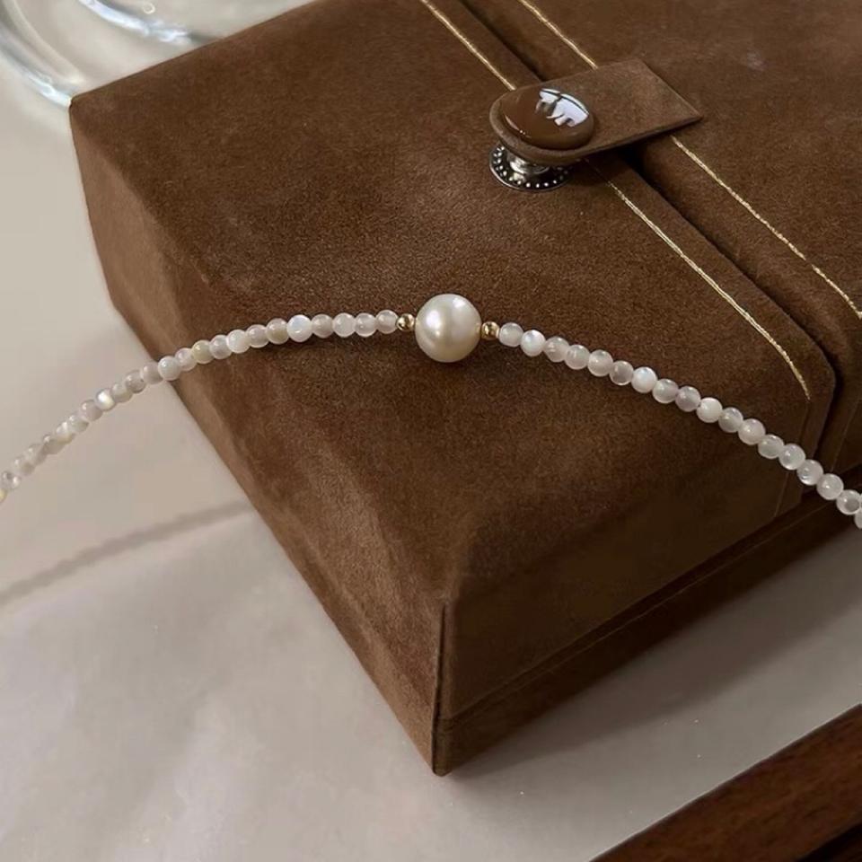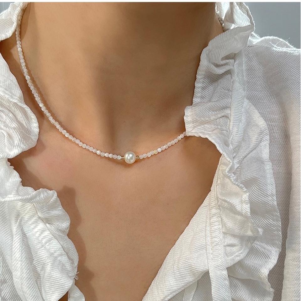 สร้อยคอมุกน้ำจืดเปลือกหอยมุกสีขาวธรรมชาติขนาดเล็ก ทรงเกือบกลม พร้อมแสงสว่างสวยงามและสายคล้องคอแบบหรูหรา