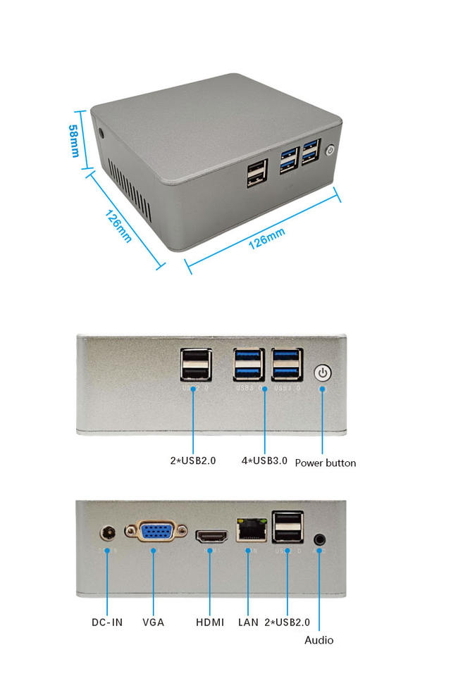 Rear I/O:1*DC-IN port; 1*HDMI; 1*VGA 1*Audio( 2 in 1) 1*RJ 45 LAN Port;