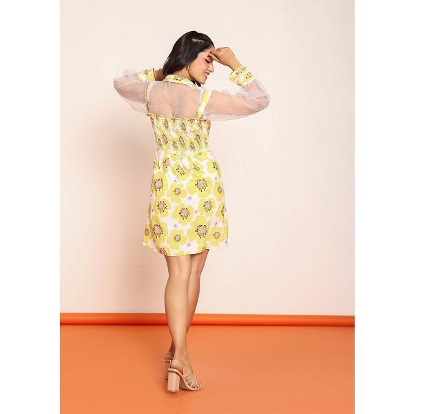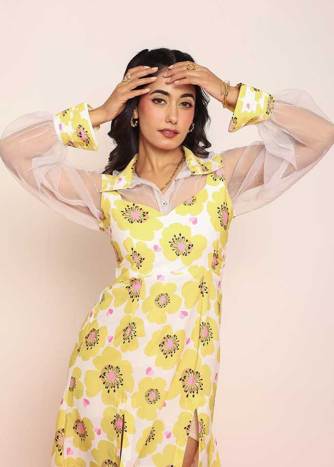 เดรสพิมพ์ลายขนาดเล็กพร้อมเสื้อออร์แกนซ่า เดรสลำลองสำหรับผู้หญิงที่มีดีไซน์ผ้าบางเบาเป็นชั้นๆ สวมใส่สบาย