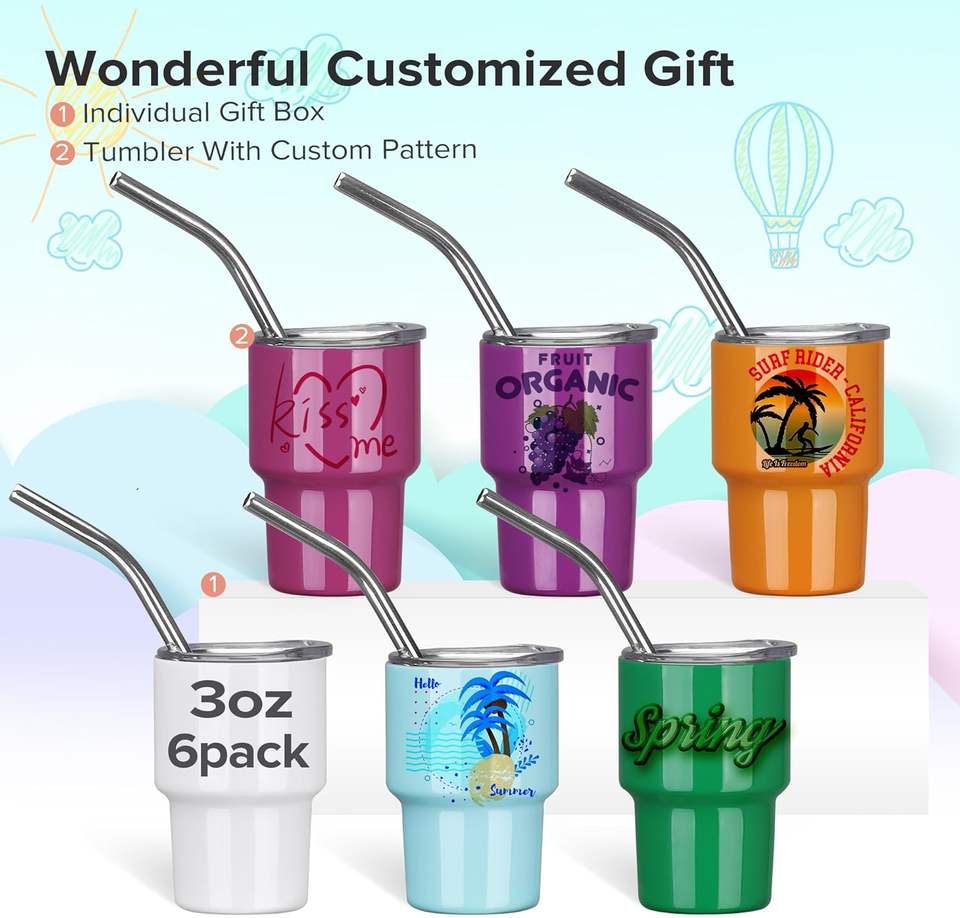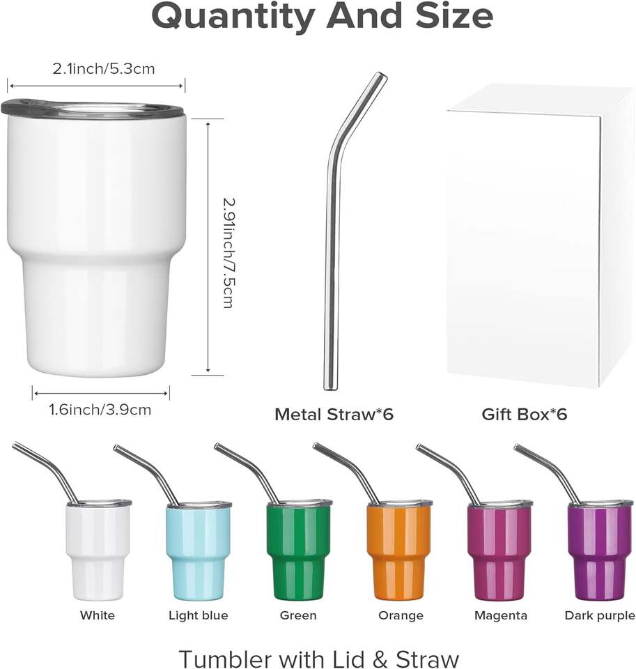 แก้วช็อตขนาดเล็กพร้อมหลอดและฝาปิด สแตนเลสสตีล สำหรับวิสกี้ ไวน์ งานปาร์ตี้ ขนาด 3 ออนซ์ แก้วช็อตแบบซับลิเมชั่น