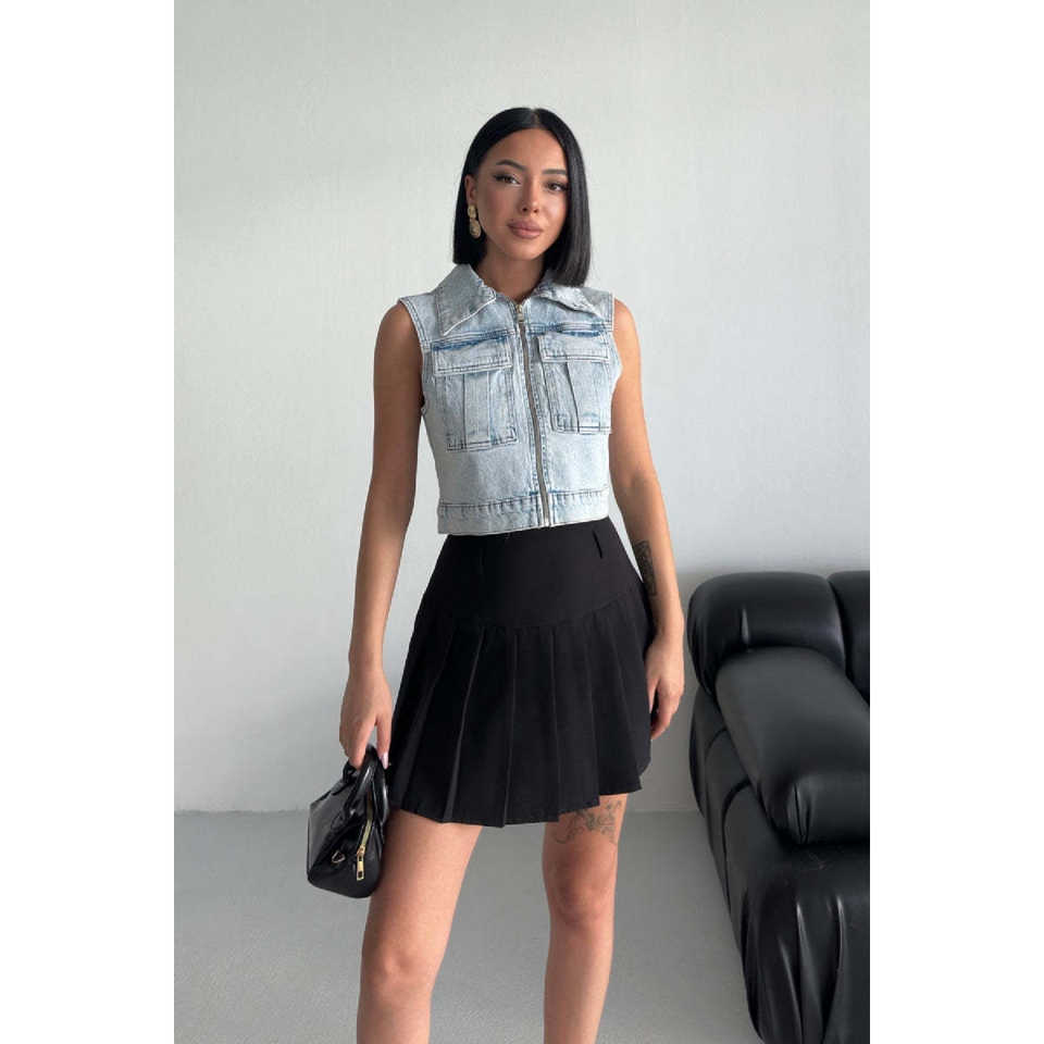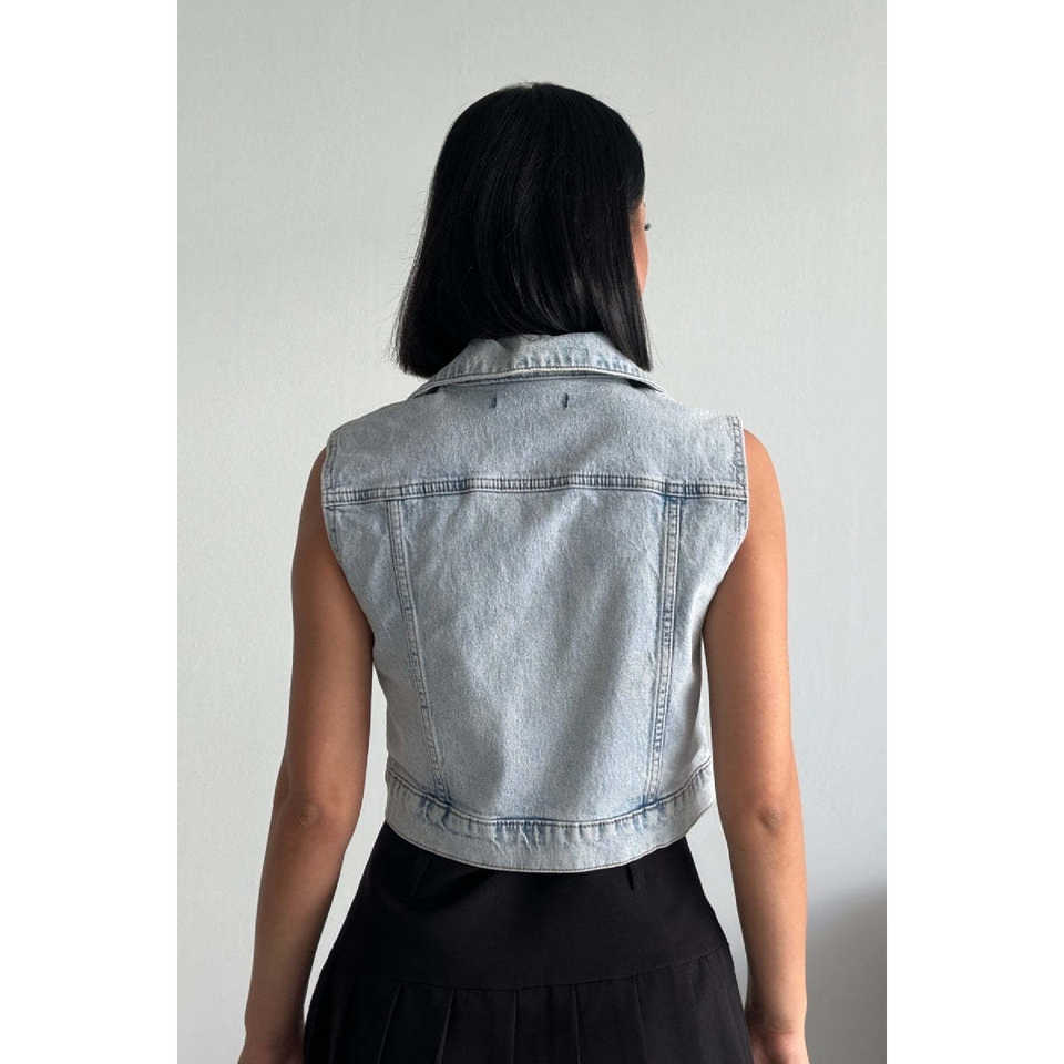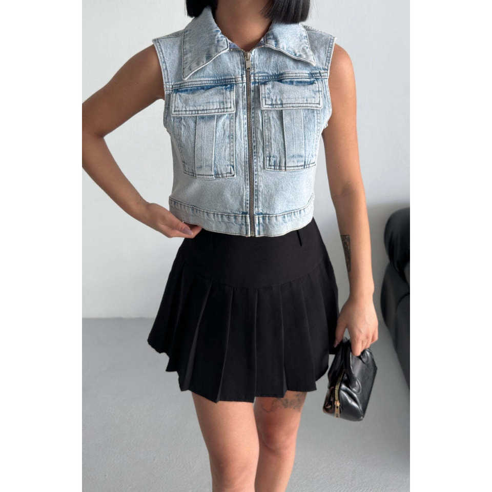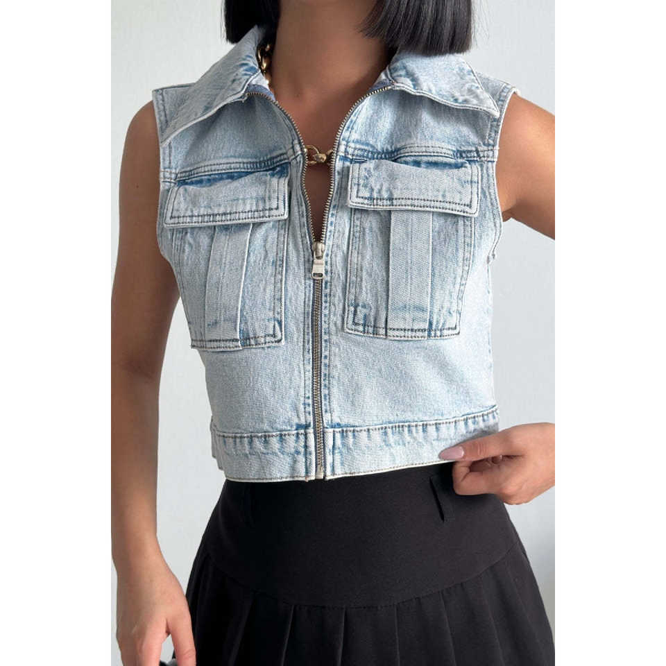 เสื้อกั๊กยีนส์วินเทจขนาดเล็ก แต่งซิป ผ้าถักโครเชต์ สไตล์เซ็กซี่ ลุคซักฟอก แต่งกระดุมโลโก้ บุด้วยผ้าฝ้าย