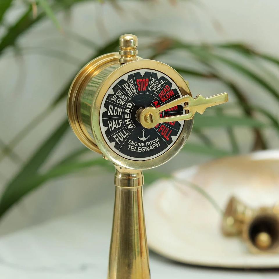 เครื่องส่งโทรเลขจำลองทองเหลืองโบราณสำหรับตกแต่งห้องเครื่องยนต์ ของตกแต่งเรือเดินสมุทรขนาดเล็ก ฐานไม้ทำมือ แรงบันดาลใจจากเรือเดินสมุทรและนักเดินเรือ