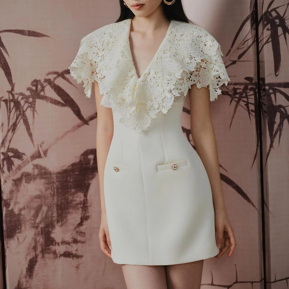 มินิเดรส OEM ODM เวียดนาม คอวีประดับลูกไม้ลายดอกไม้สีขาว ชุดเดรสสีงาช้าง แบรนด์ท้องถิ่น ดีไซน์หรูหราด้วยลูกไม้ลายดอกไม้