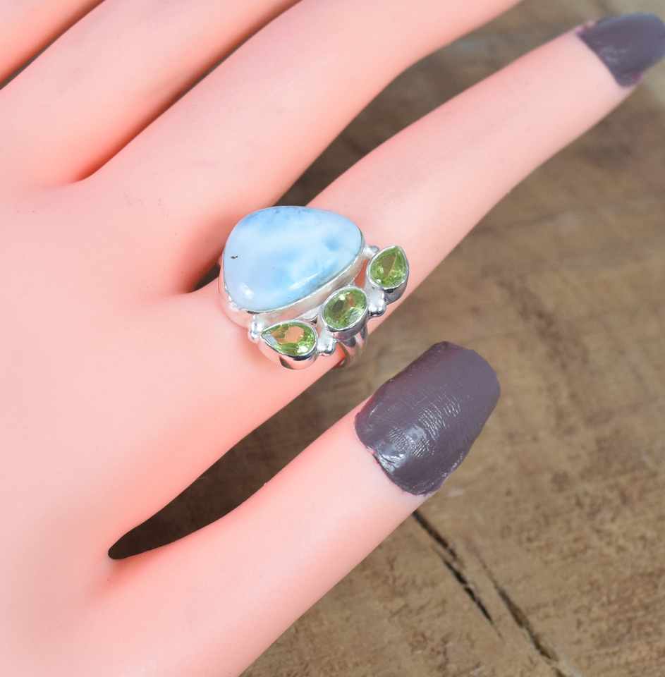 แหวนแต่งงานสไตล์โบฮีเมียนประดับอัญมณีลาริมาร์และเพอริโดสีเงินแท้925มินิมอล