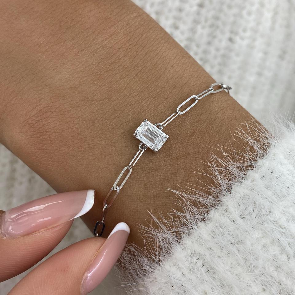 สร้อยข้อมือเพชรทรงมินิมอลแบบคลิปหนีบ 14K ทองคำขาว ประดับเพชรแล็บคัตทรงมรกต 1 กะรัต พร้อมใบรับรอง IGI เครื่องประดับชั้นดี ของขวัญวันเกิดสำหรับผู้หญิง