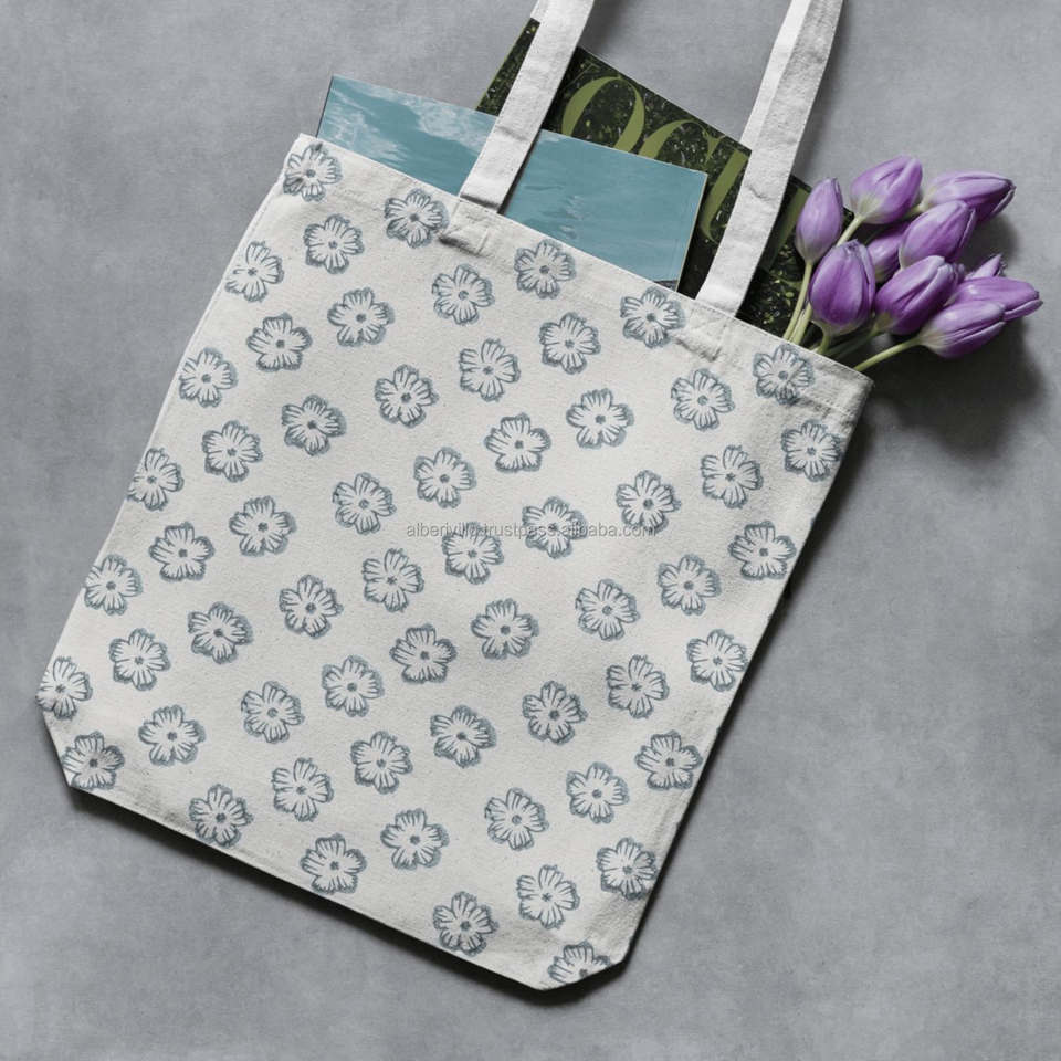 ถุงช้อปปิ้งลายดอกไม้พิมพ์มือแบบมินิมอล ถุงช้อปปิ้งซักได้ พร้อมโลโก้ ถุงใส่เสื้อผ้าพิมพ์ลายตามสั่ง