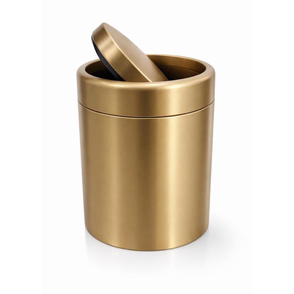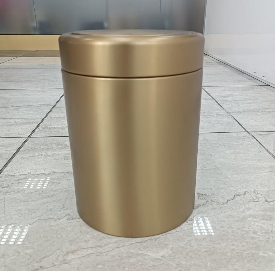 ถังขยะโลหะสีทองด้านแบบมินิมอลพร้อมฝาปิด เหมาะสำหรับห้องน้ำ ห้องนอน สำนักงาน และของตกแต่งบ้านหรู ขายส่งจากอินเดีย