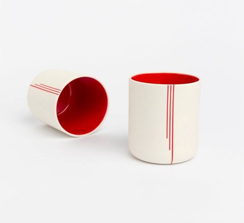 แก้วกาแฟเซรามิกสีขาวและแดงลายเส้นเด่น ดีไซน์เรียบหรู สำหรับชา กาแฟ ใช้ในครัวทันสมัย