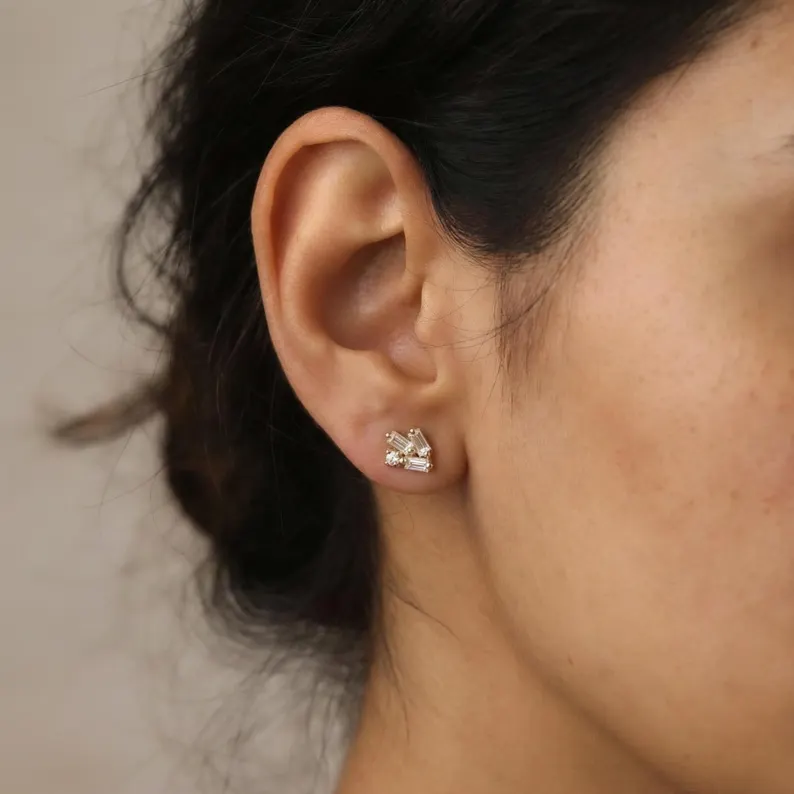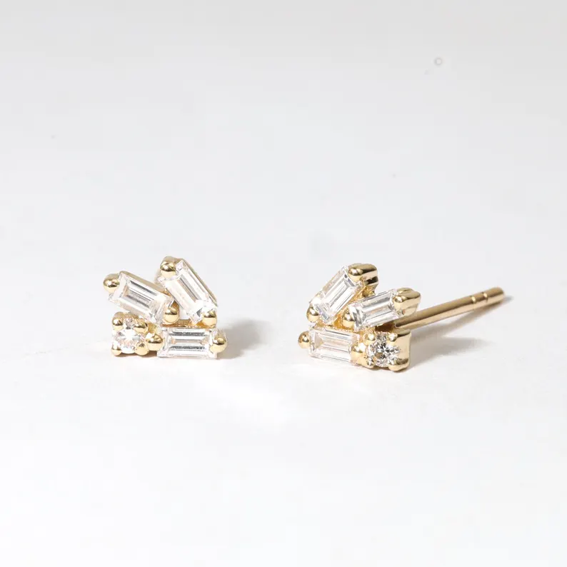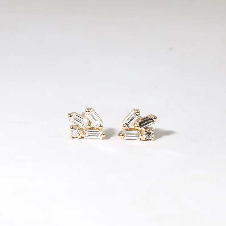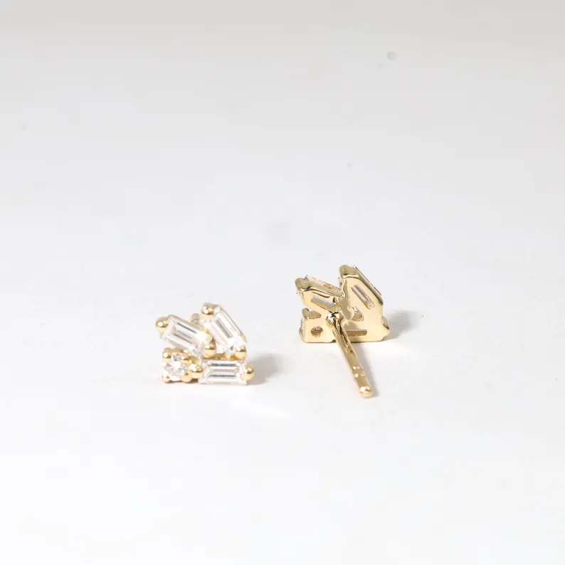 ต่างหูแบบมินิมอล ทอง 14K ประดับเพชรแล็บโกรว์ทรงบาแกตต์ ดีไซน์เรขาคณิต งานแฮนด์เมด ของขวัญเครื่องประดับ