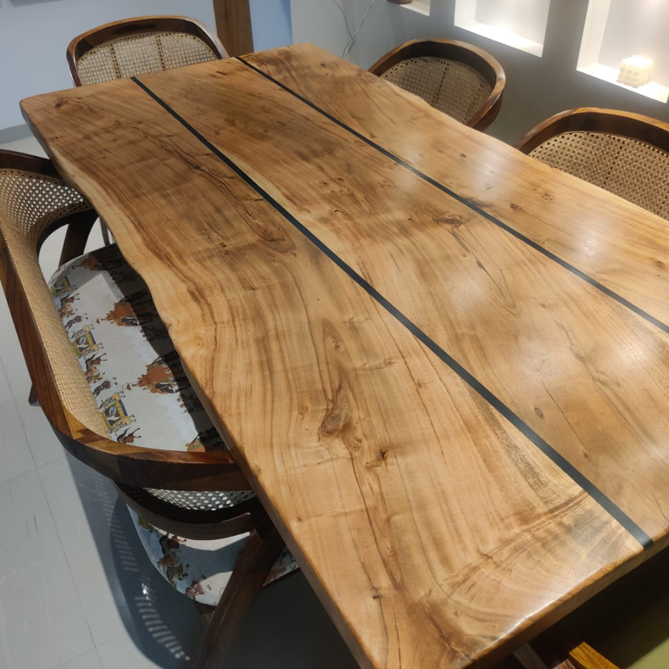 โต๊ะรับประทานอาหารไม้อะคาเซียแบบเรียบง่ายขาโลหะรูปทรงสี่เหลี่ยมผืนผ้าทนทานดีไซน์ขอบสดสำหรับโรงแรมบ้านไร่