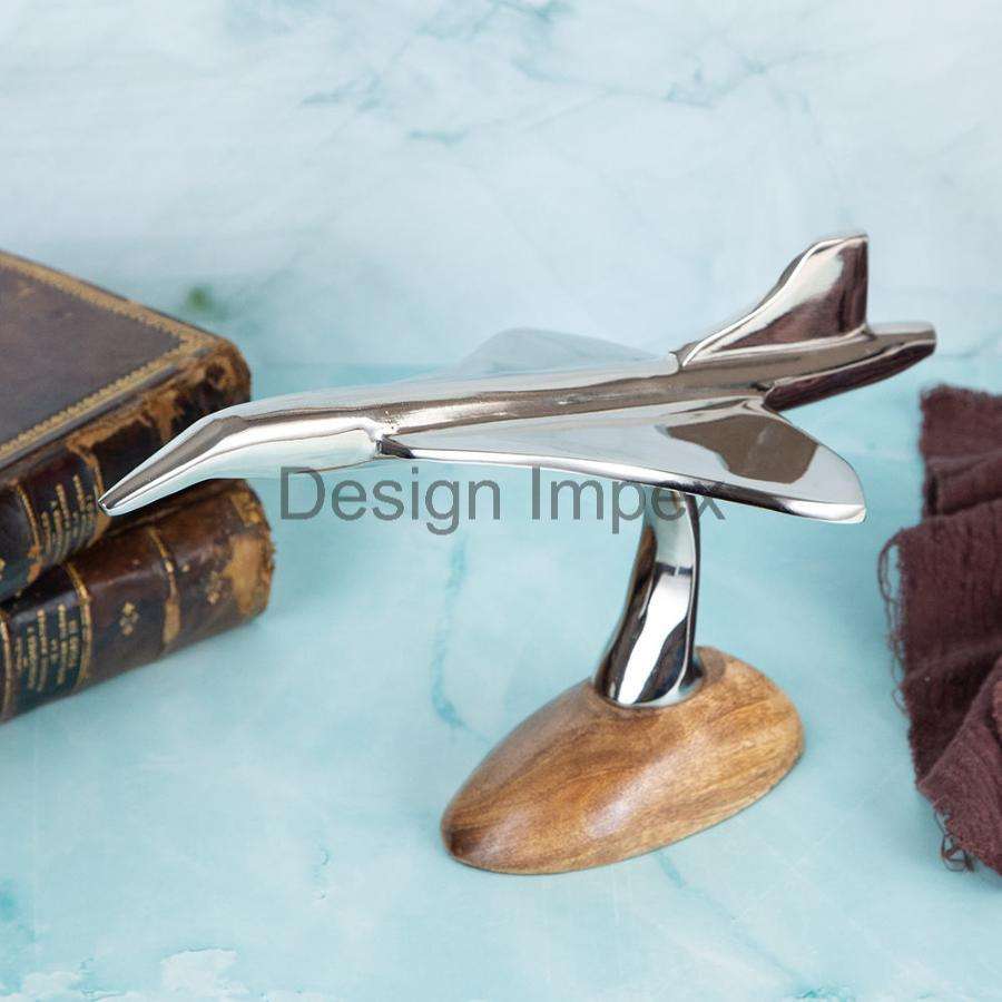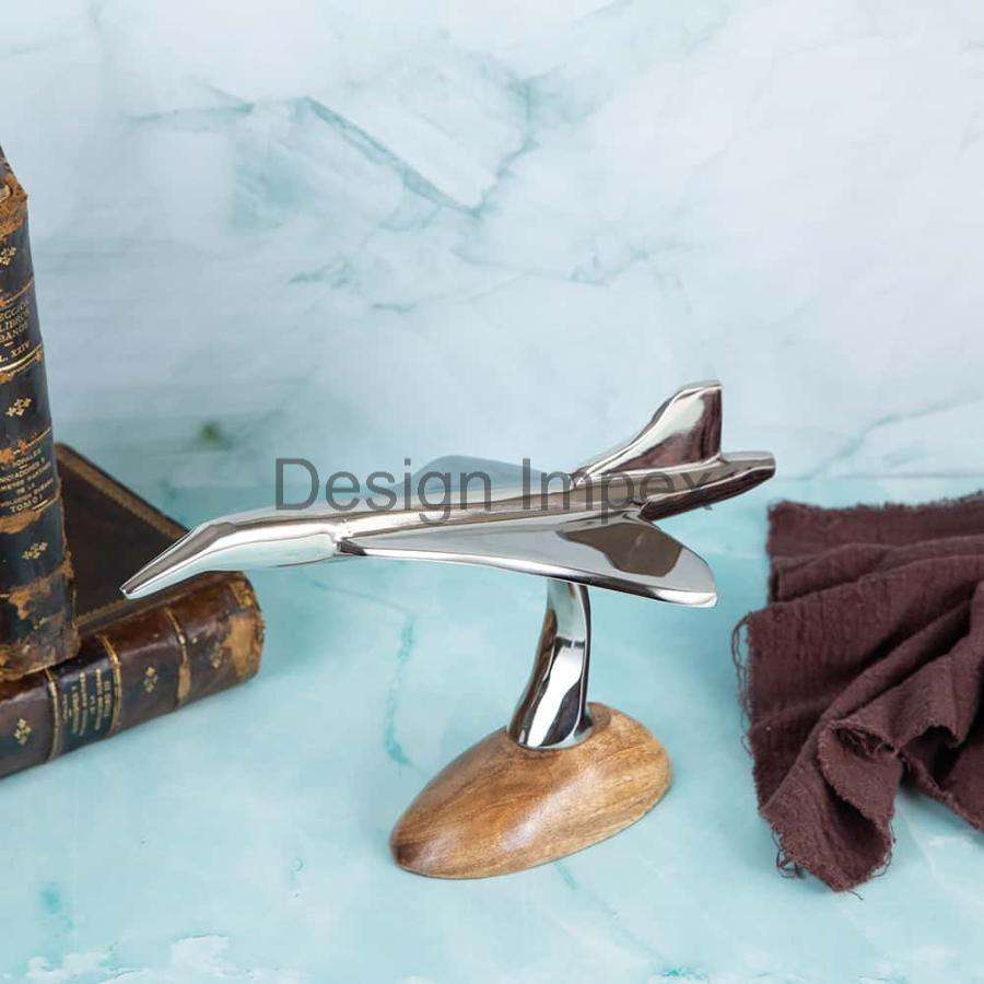 โมเดลเครื่องบินแบบมินิมอลทำด้วยมือรูปปั้นเครื่องบินเครื่องเงินตกแต่งโต๊ะของขวัญเครื่องประดับวัตถุเครื่องบินฐานไม้