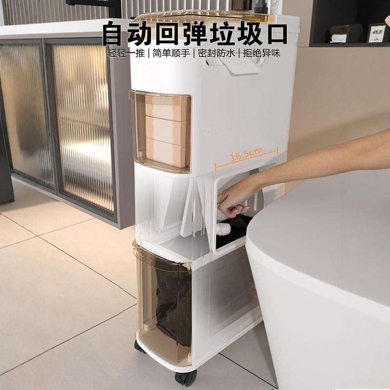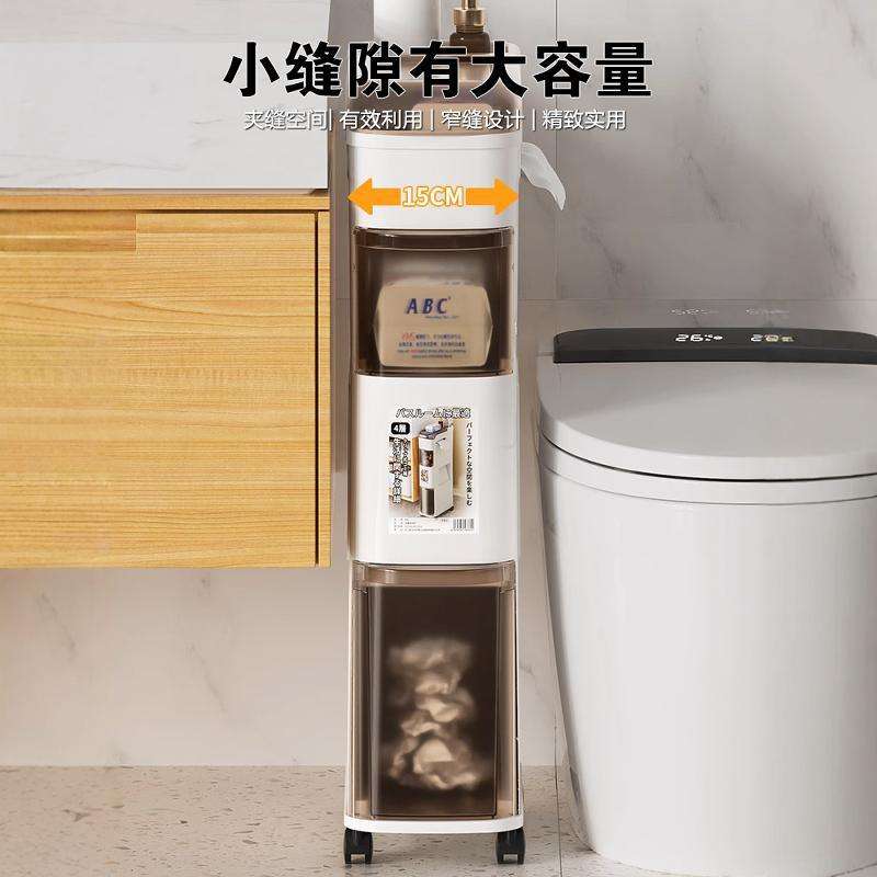ตู้เก็บของในห้องน้ำแบบมินิมอล 3 ชั้น วัสดุ PP ประหยัดพื้นที่ พร้อมล้อเลื่อน สำหรับจัดเก็บในช่องแคบ
