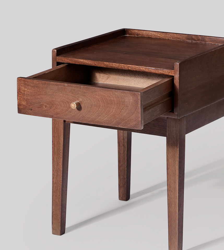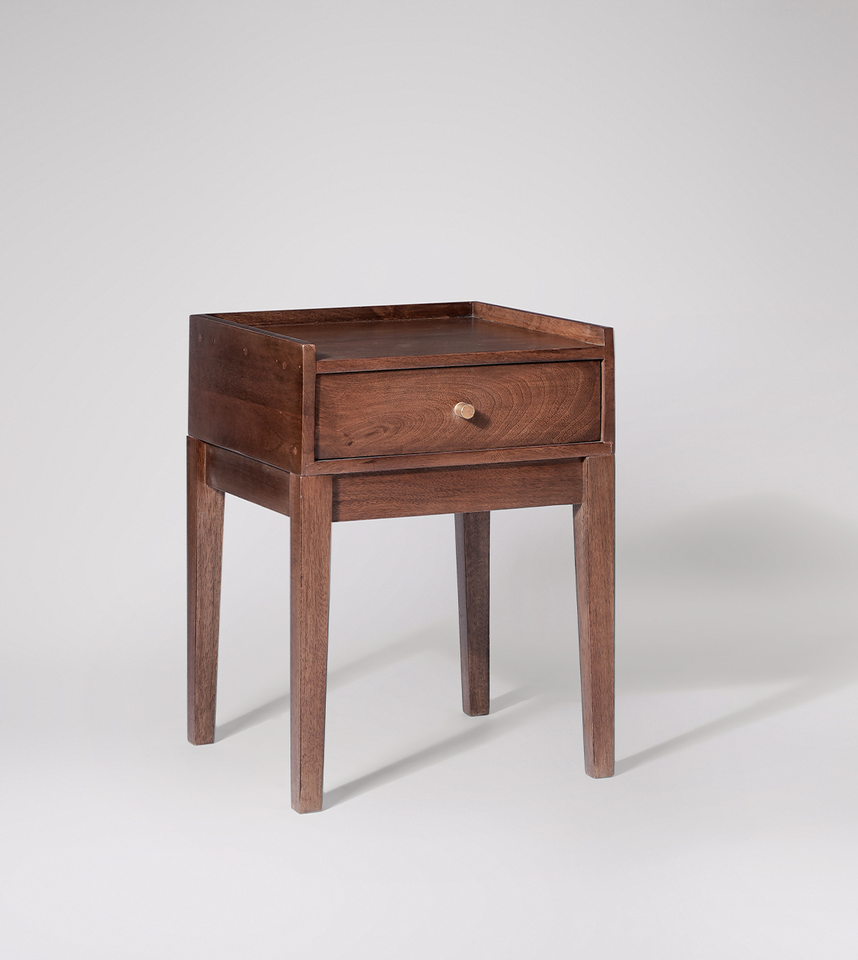โต๊ะข้างเตียงที่เรียบง่ายในการตกแต่งด้วยไม้สีเข้ม
