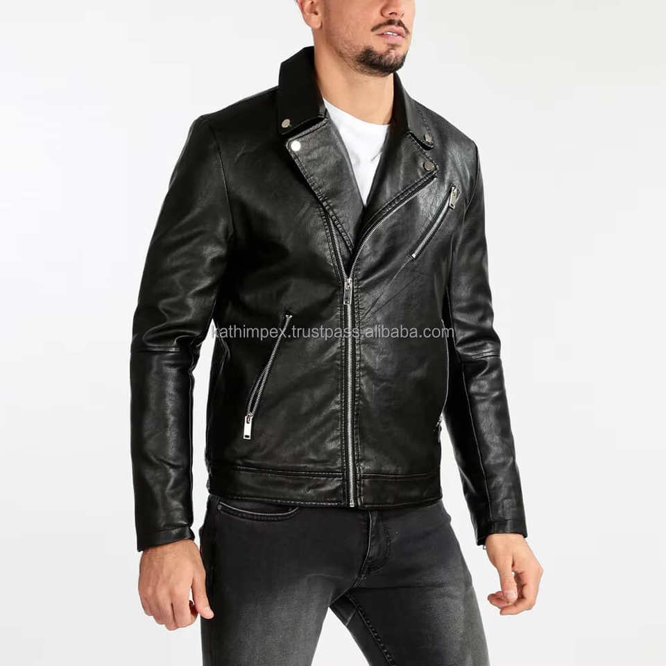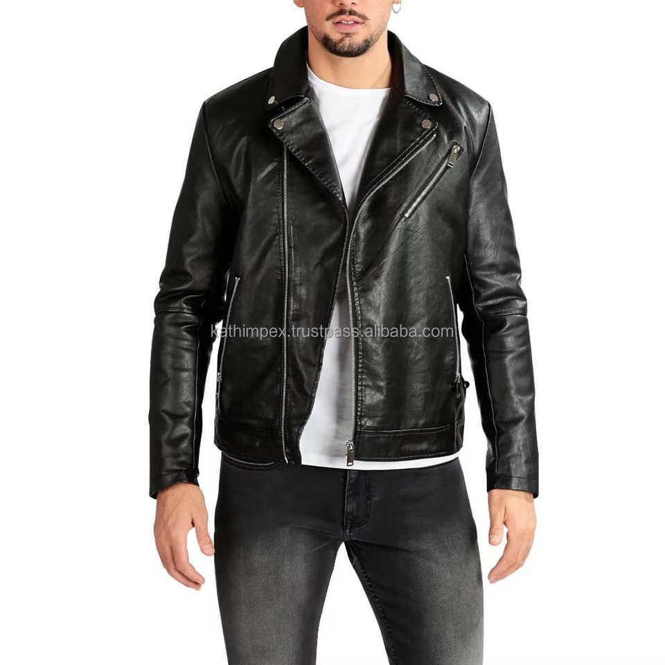 แจ็คเก็ตหนังทรงเข้ารูปสีดำสไตล์มินิมอลสำหรับผู้ชาย พร้อมซิปด้านหน้าแบบอสมมาตรและปกคอพับลง เหมาะสำหรับใส่ลำลองในฤดูหนาวสไตล์ไบค์เกอร์