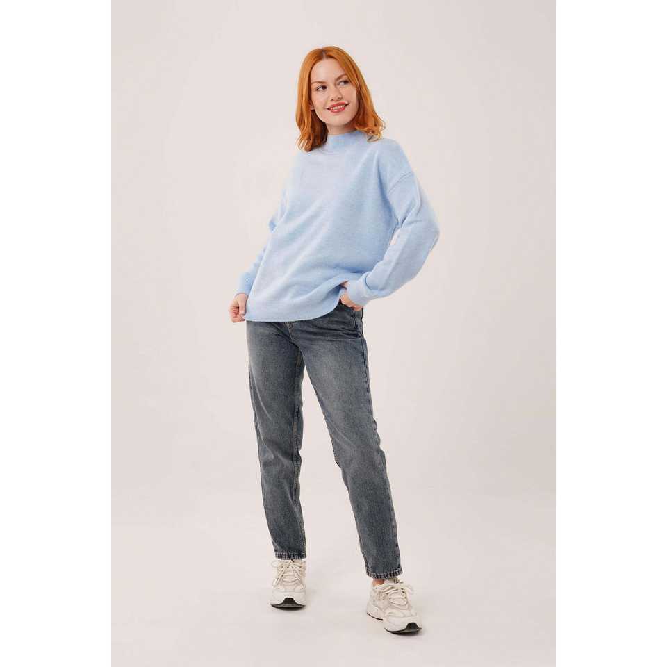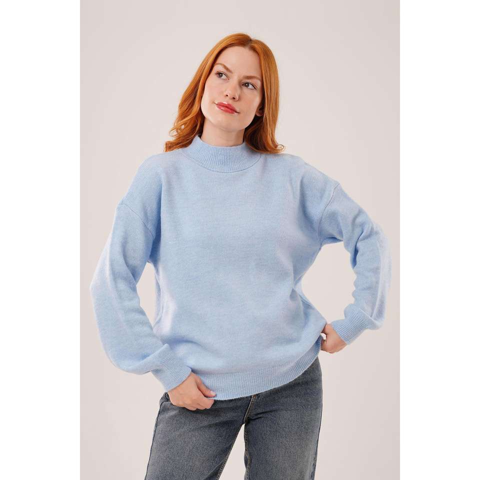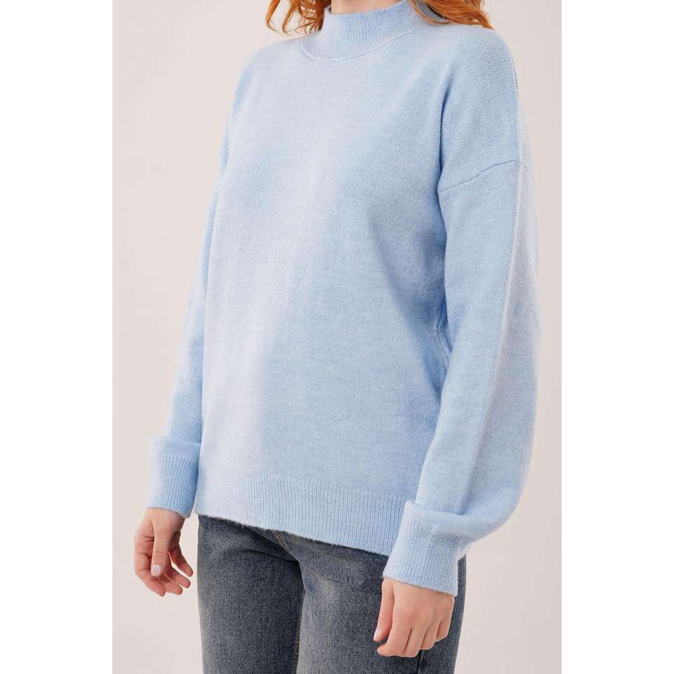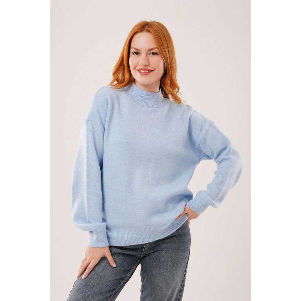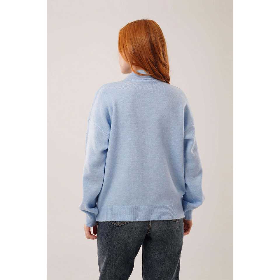 เสื้อสเวตเตอร์ถักสีน้ำเงินสไตล์มินิมอลสำหรับผู้หญิง แขนยาว ป้องกันขนร่วง คอริบ 16 กรัม แบบพื้นฐาน