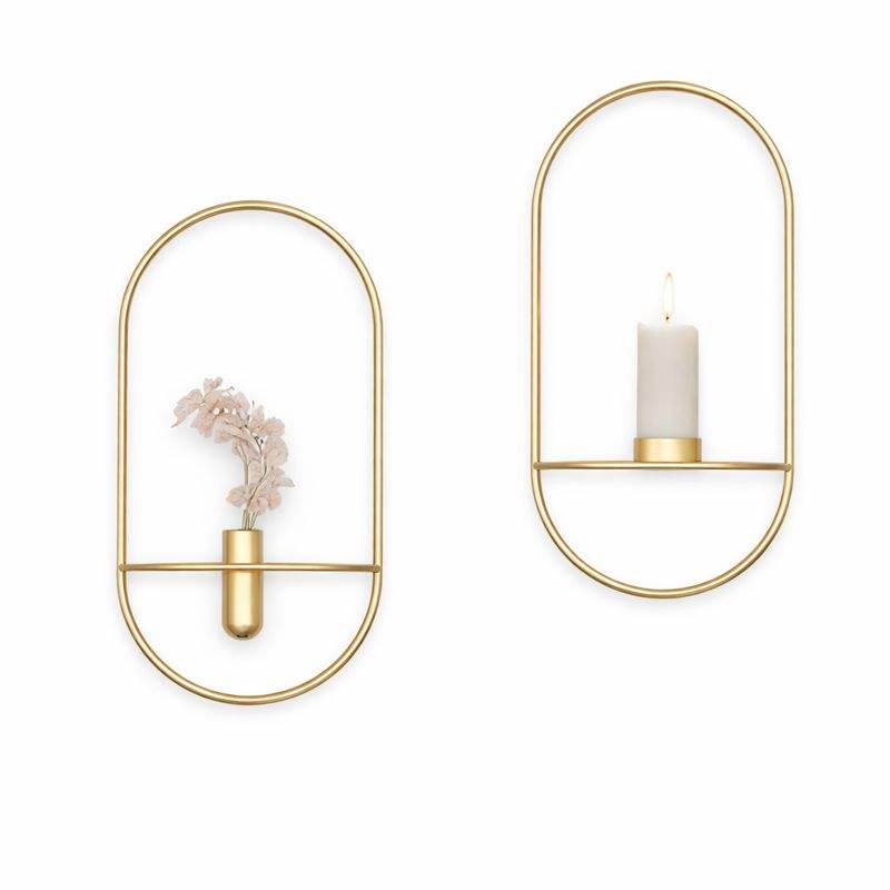 Minimalist Brass Wall Sconce Set Modern Metal Frame Dual Use Candle Flower Holder Elegant Home Accent Decor