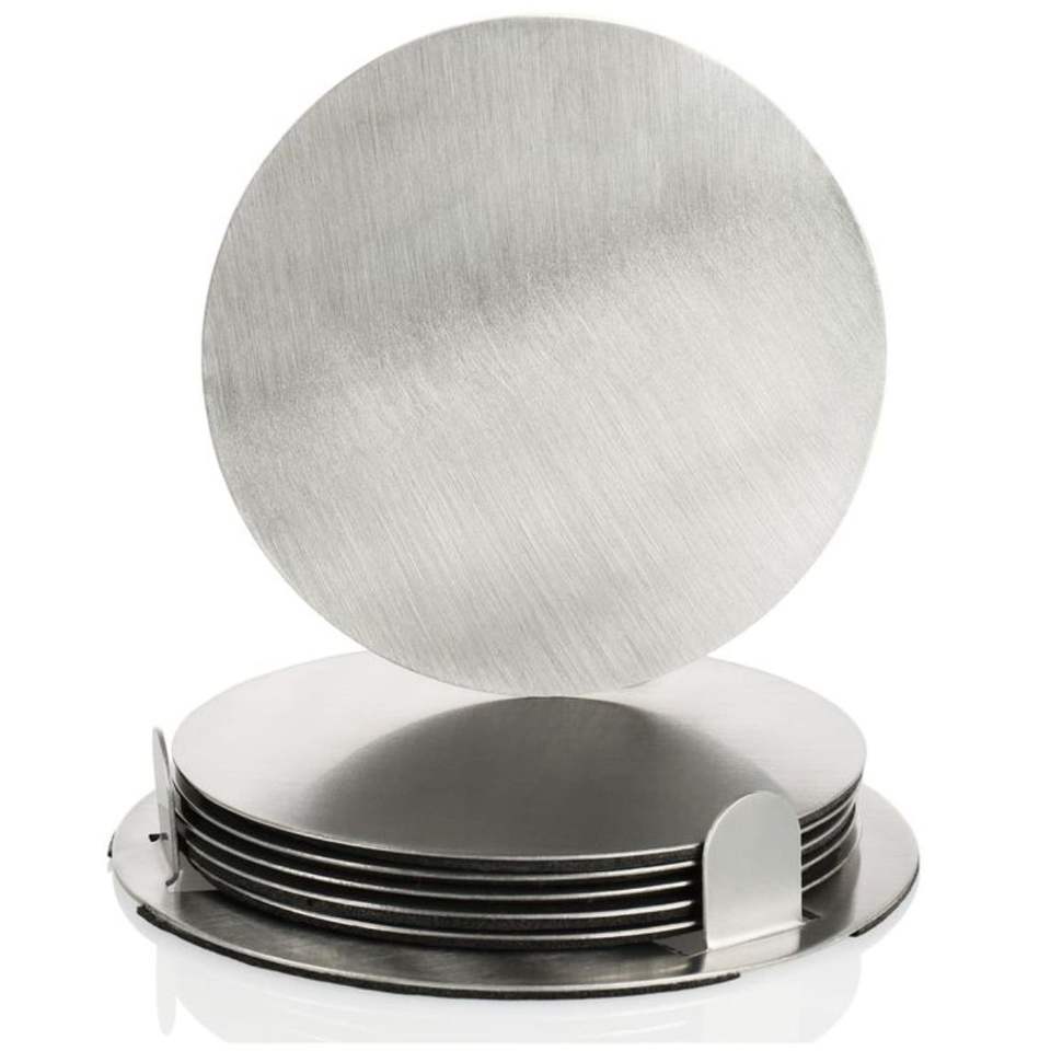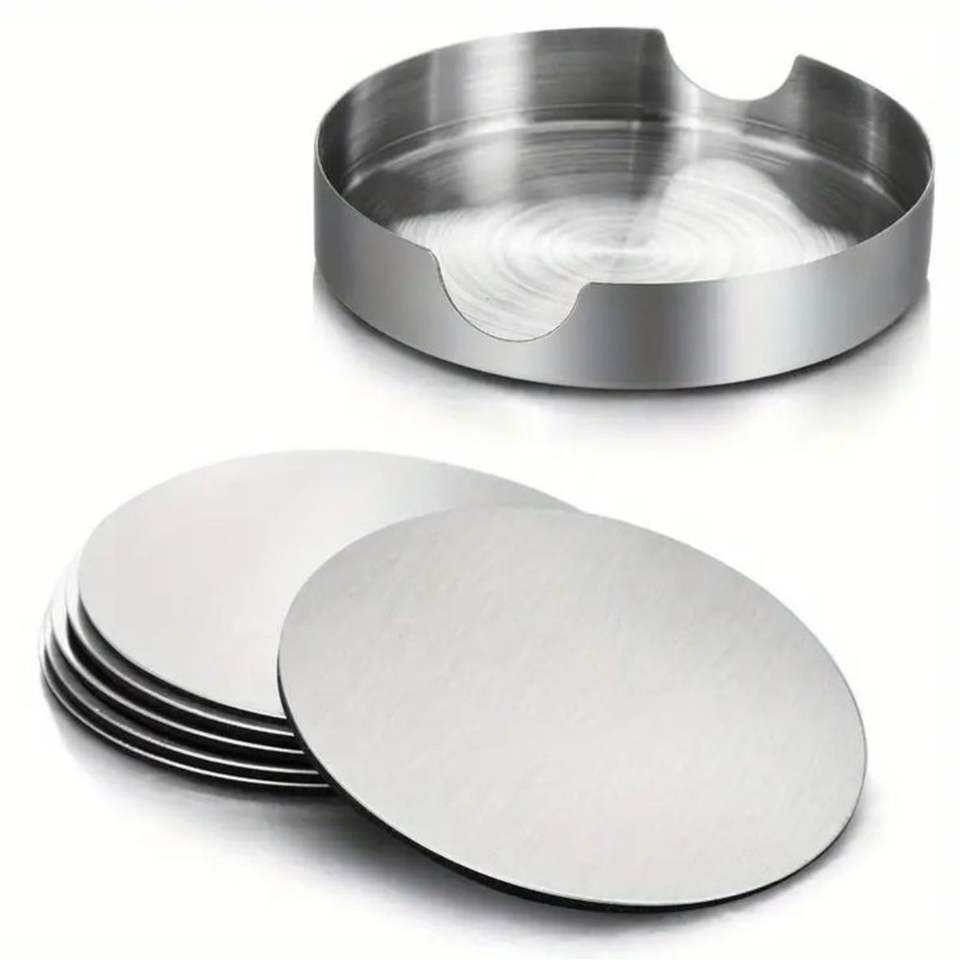 ชุดจานรองแก้วโลหะขัดเงาแบบมินิมอล 6 ชิ้น | แผ่นรองแก้วสแตนเลสสไตล์นอร์ดิกพร้อมที่เก็บของ ชุดอุปกรณ์บนโต๊ะอาหารระดับพรีเมียม