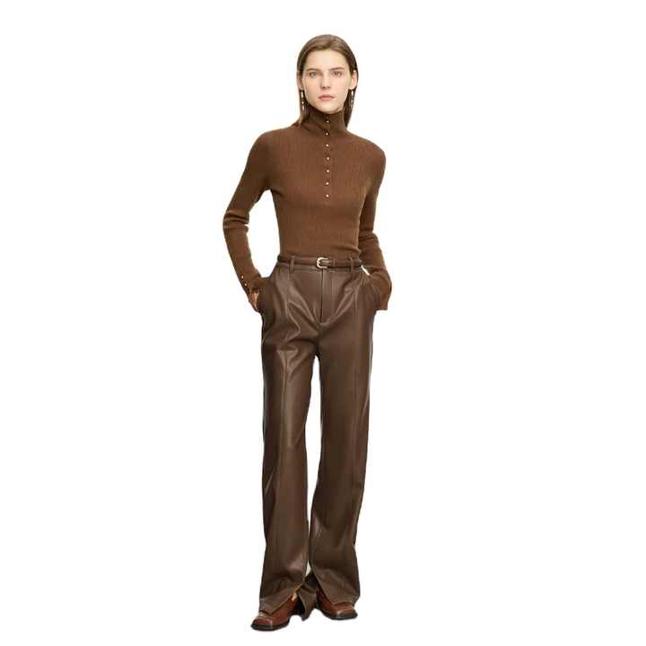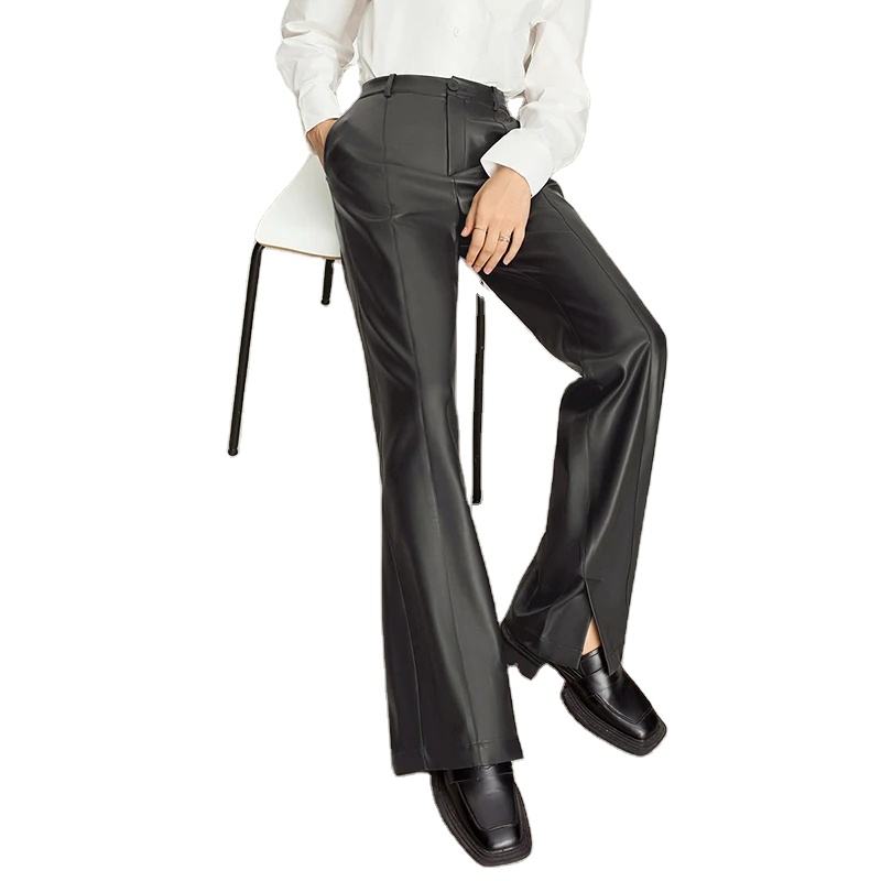 กางเกงลำลองสไตล์มินิมอลสำหรับผู้หญิง คอลเลคชั่นฤดูใบไม้ร่วง 2025 กางเกงหนัง PU ทรงหลวม ขาตรง ผ่าข้าง สไตล์สาวออฟฟิศ