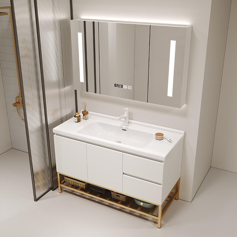 24 "โต๊ะเครื่องแป้งในห้องน้ำที่ทันสมัยเก็บของขนาดใหญ่สีขาวที่ประกอบไว้ล่วงหน้าอ่างล้างหน้าแบบชิ้นเดียวก๊อกน้ำระบายน้ำได้แบบอิสระ