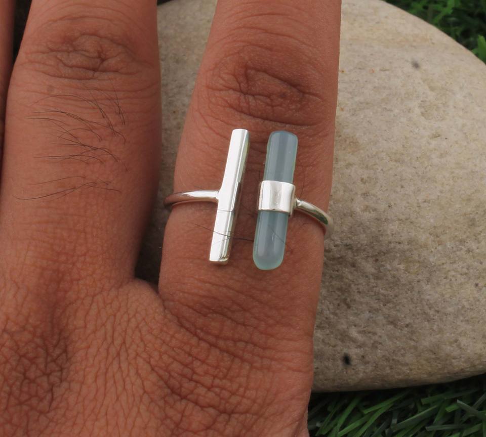 แหวนเงินแท้ประดับพลอยอะคาเซดอนสีฟ้าธรรมชาติทรงคลาสสิกแบบมินิมอลสำหรับผู้หญิง ของขวัญวันครบรอบ